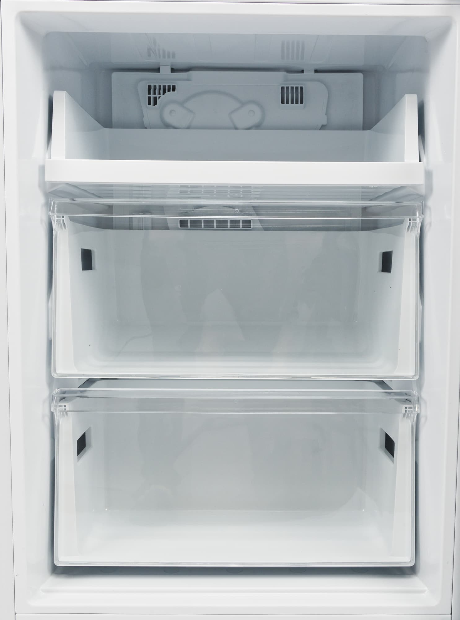 В морозильном отделении — два ящика с прозрачными передними стенками и одна полка, размещенная над ними. У ящиков одинаковая высота, но разная глубина: за нижним скрывается ниша холодильного агрегата.