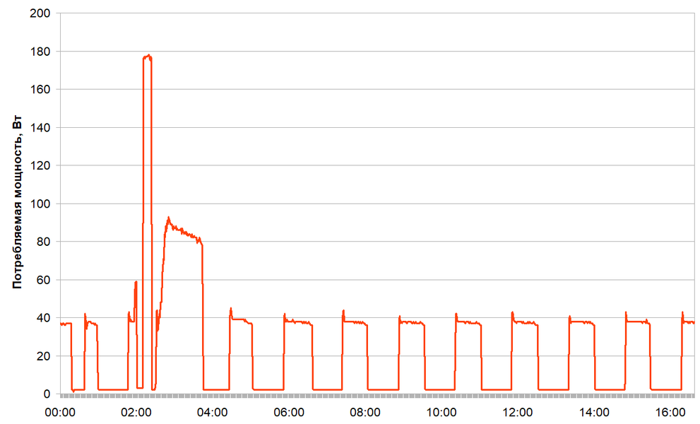 При переключении режимов охлаждения (к примеру, в случае смены «Cold» на «Colder» или «Coldest») потребляемая мощность возрастает в пиках до 178 Вт и плавно снижается до 80-90 Вт до тех пор, пока температура внутри камеры не достигнет оптимальной.