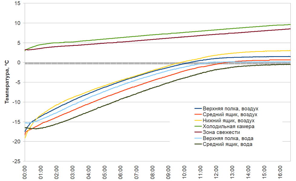 На графике можно видеть, что приблизительно через 11 часов после начала теста температура в контейнере на верхней полке пересекла нулевую отметку. Таяние льда в среднем ящике началось значительно позже: почти через 39 часов с момента отключения электричества.