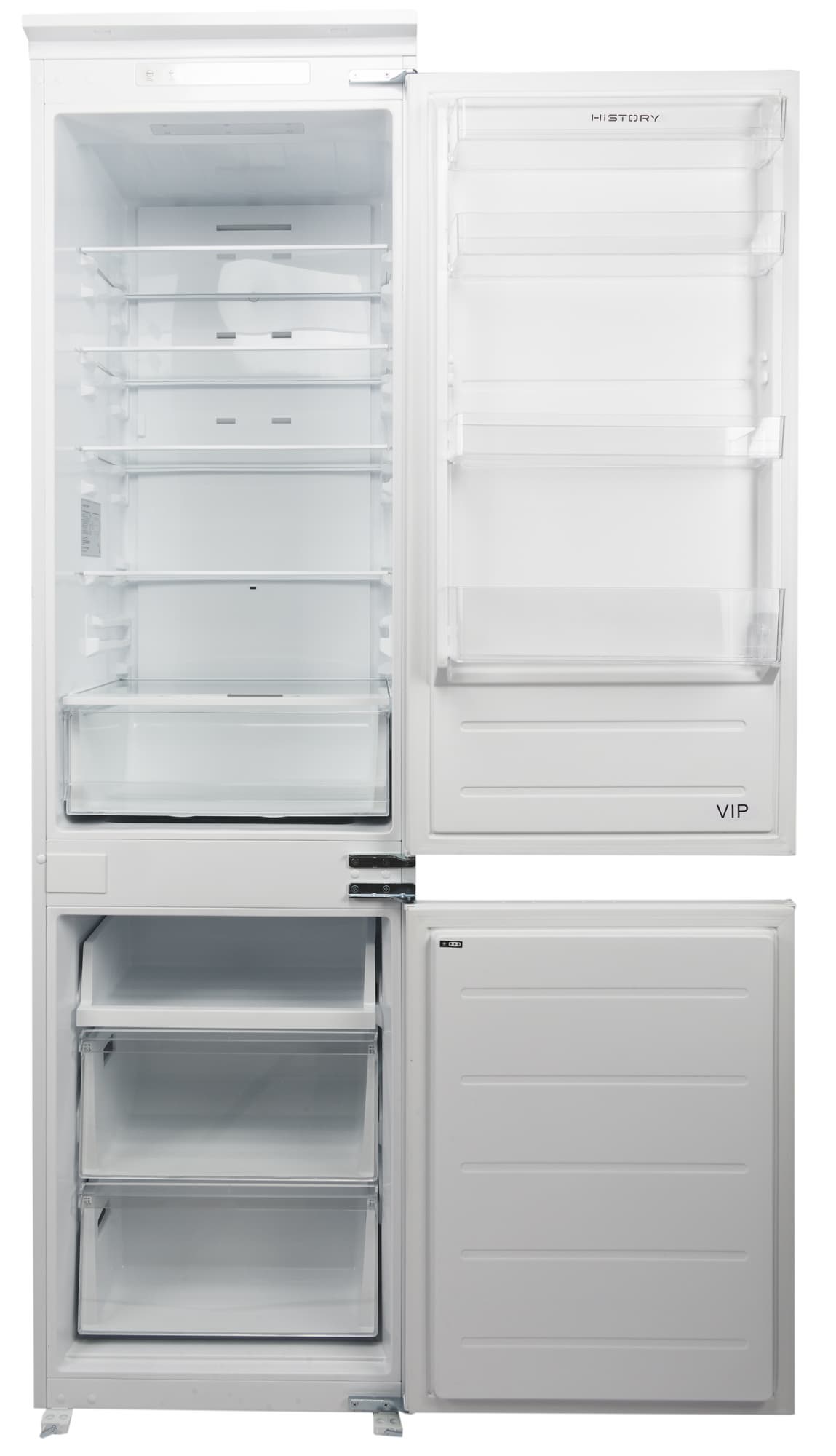 Встраиваемый двухкамерный холодильник HiStory BRB 1940MI понравился нам простотой управления и продуманной организацией пространства холодильной камеры. Возможность гибкой конфигурации полок позволит разместить на них емкости любого размера.