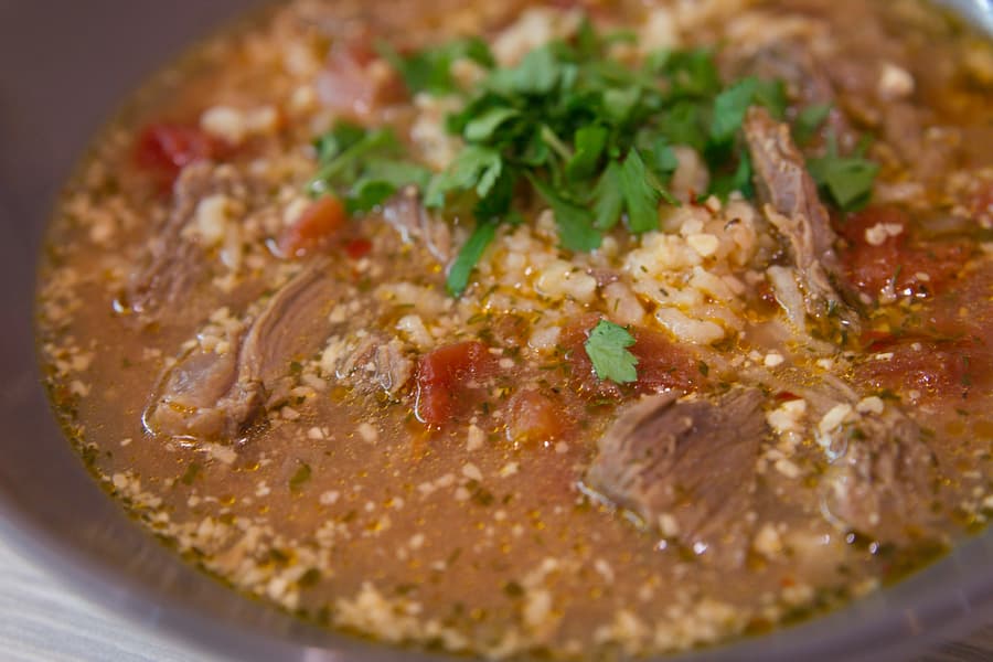 Тем временем достали из кастрюли сварившееся мясо, нарезали и вернули в горячий бульон. Добавили томатную смесь из сковороды, столовую ложку аджики, ткемали, горсть измельченных грецких орехов и предварительно промытый рис. Перемешали и варили ровно 10 минут на 7-й мощности. Затем выключили плиту и оставили суп под плотно закрытой крышкой примерно на час. Надо бы дольше, но у нас не выдержали нервы — аромат сумасшедший и вкус такой же.