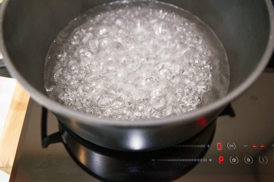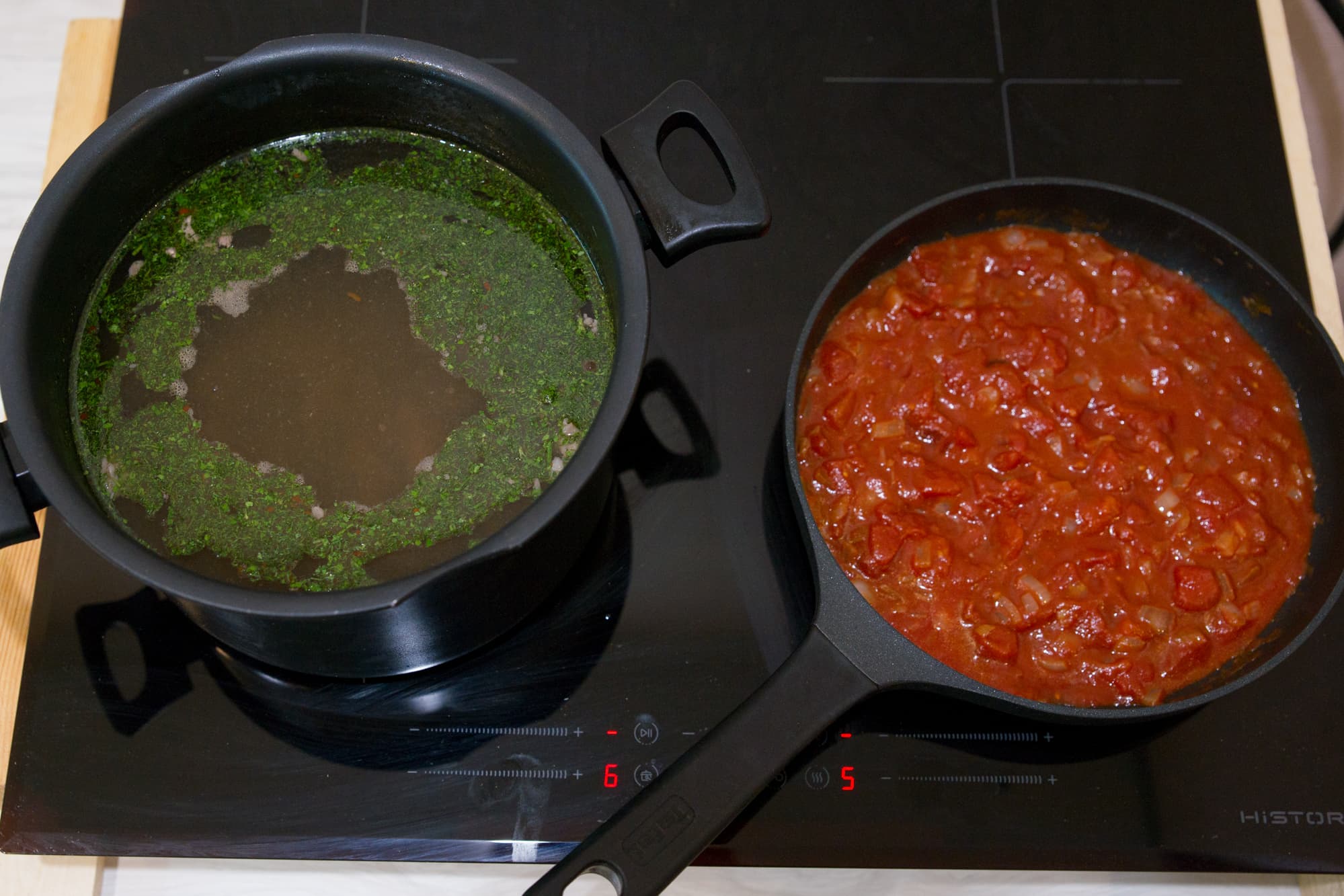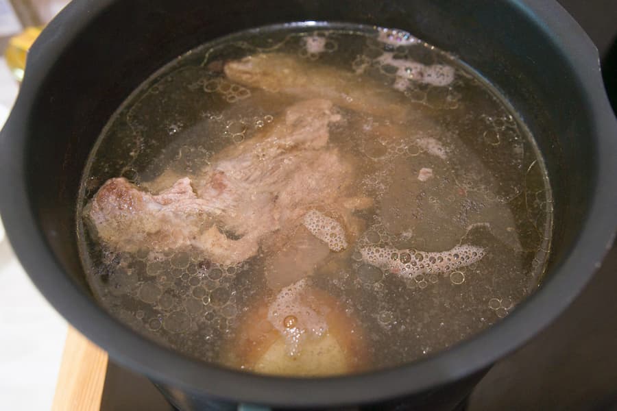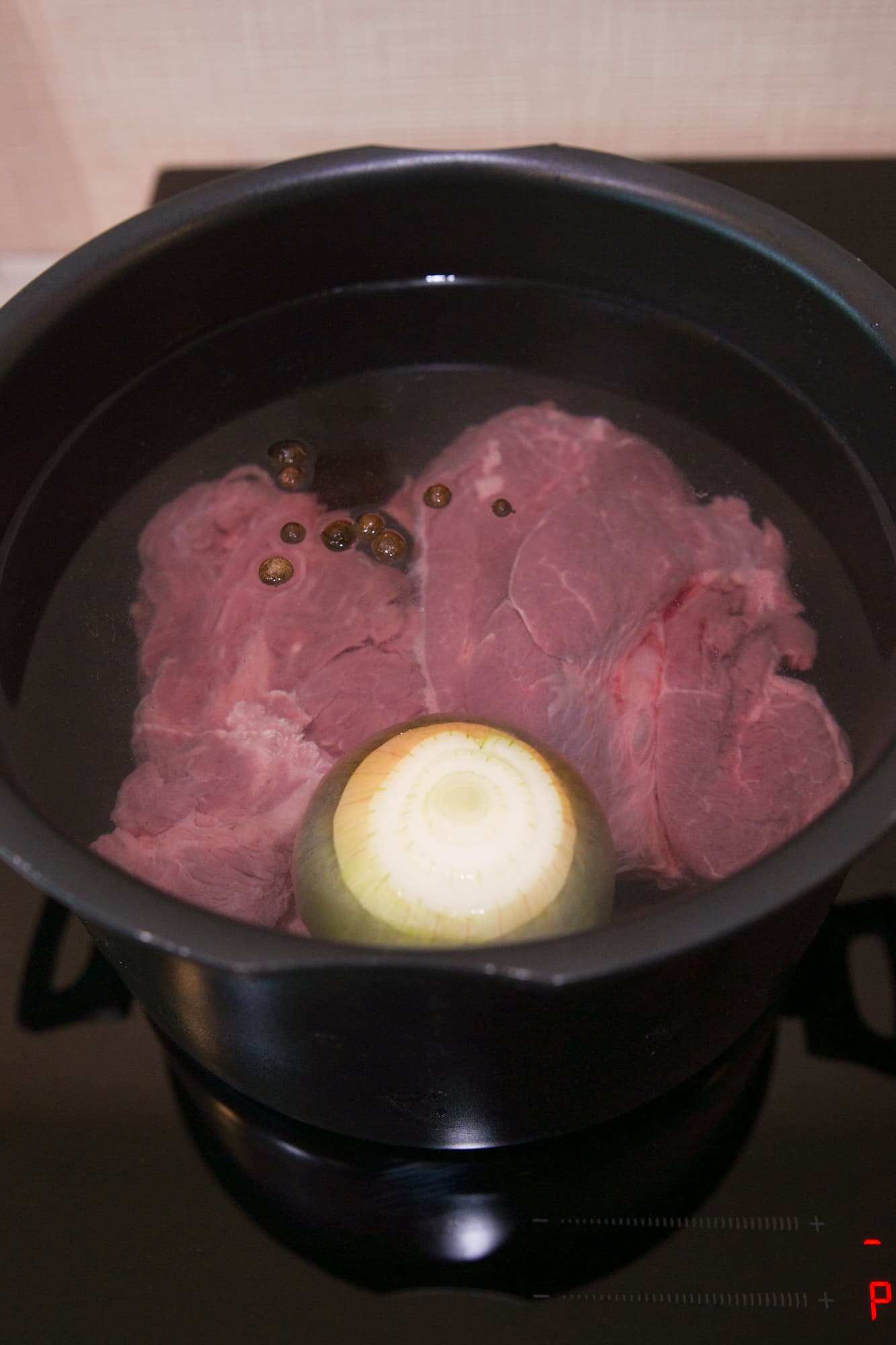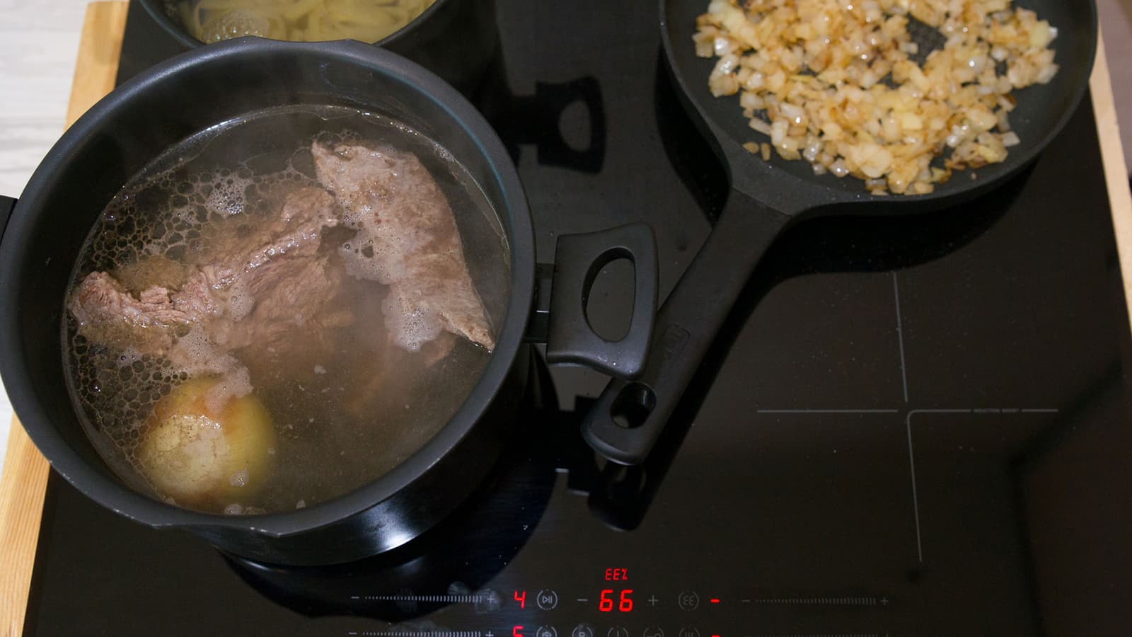 Для бульона мы взяли 800 г бескостной говядины, залили четырьмя литрами холодной воды, посолили, добавили горошины душистого черного перца и одну большую очищенную луковицу. Включили Boost, который позже сменился на 9-й уровень мощности, и так за 15 минут довели содержимое кастрюли до кипения.