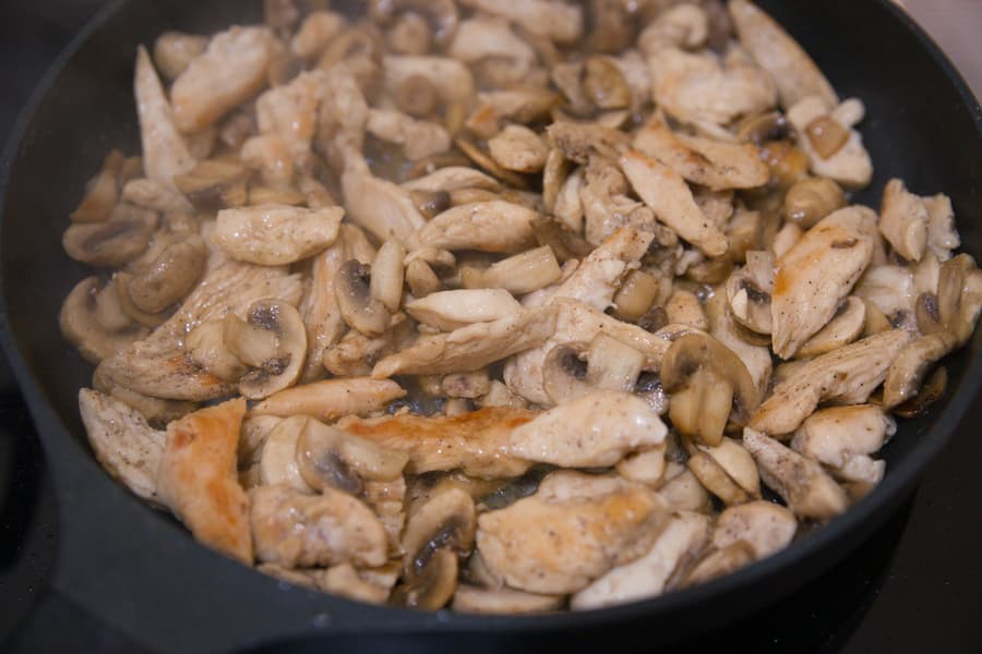Одновременно с супом мы начали готовить пасту. На 9-й мощности обжарили в раскаленном масле кусочки куриного филе с шампиньонами.