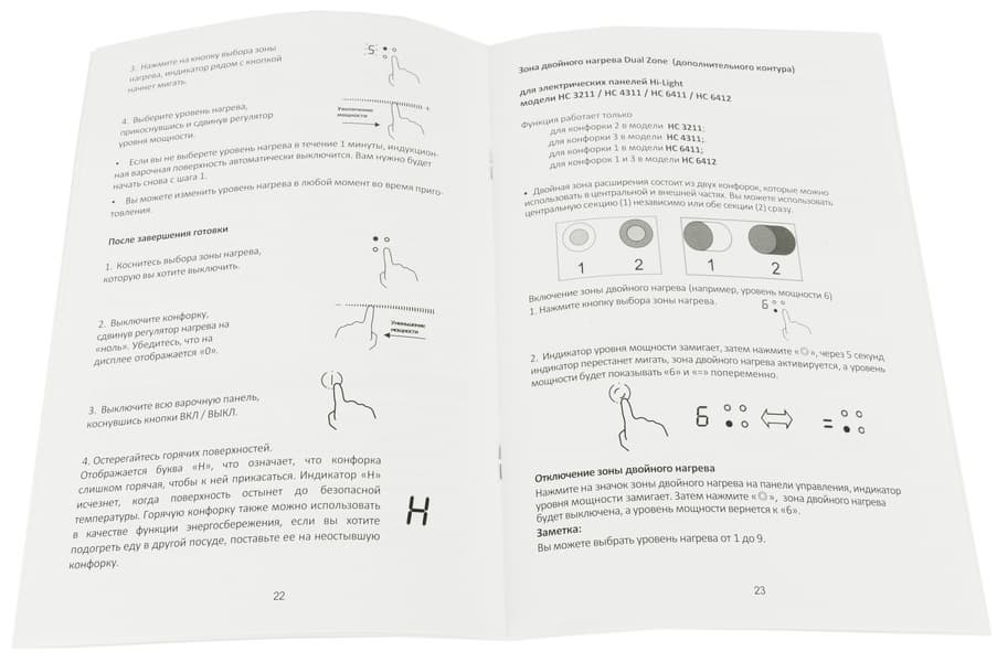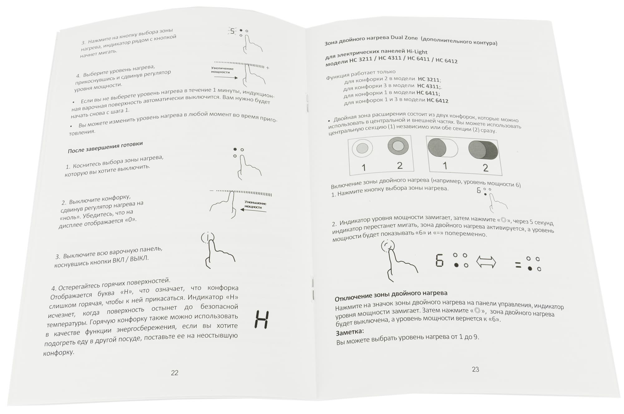 К варочной панели прилагается инструкция по эксплуатации в виде 43-страничной брошюры, напечатанной на качественной глянцевой бумаге.