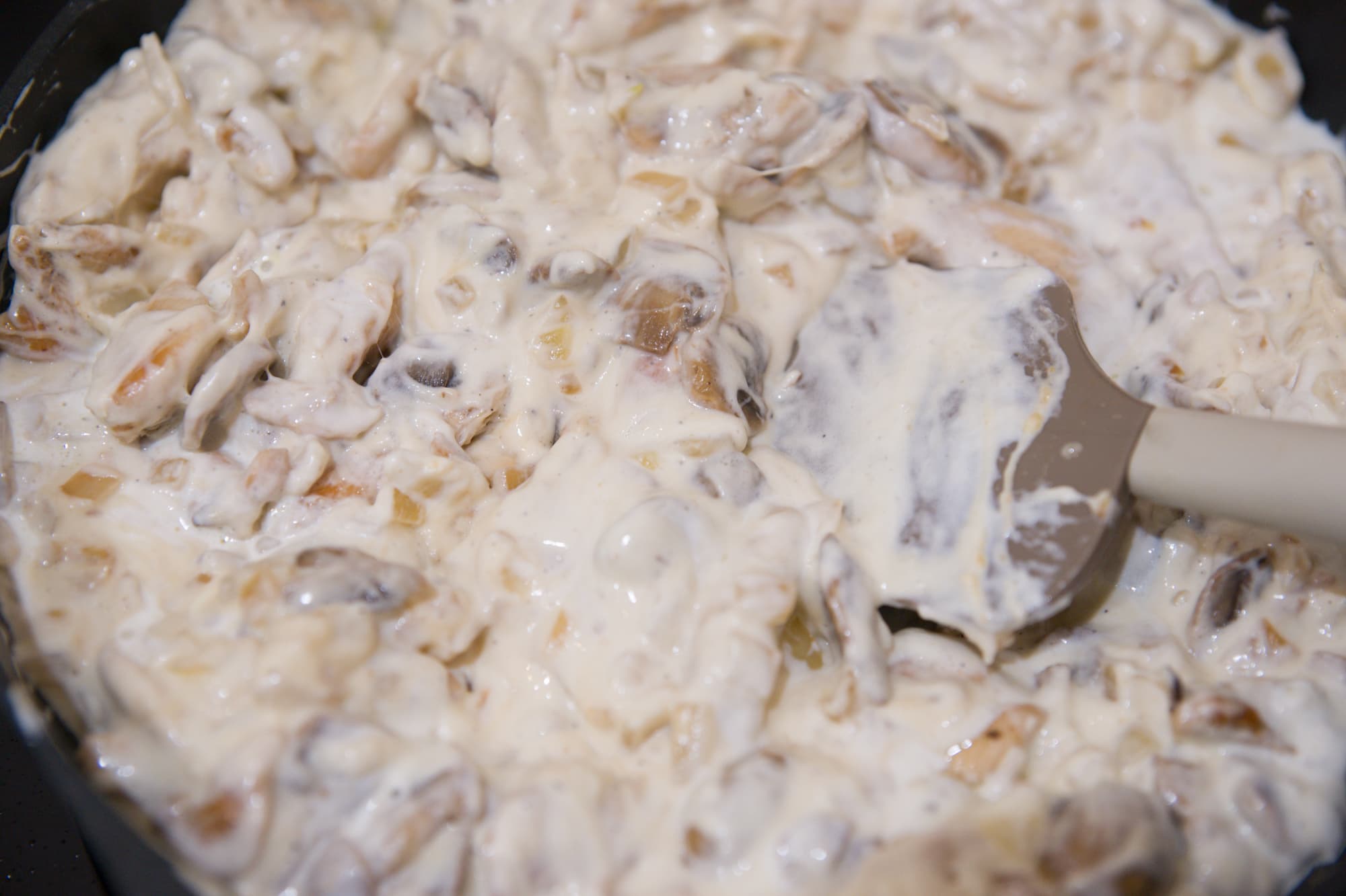 Затем добавили к ним мелко нарезанный лук. Позже влили сливки, добавили тертый сыр, немного соли и перца, измельченный чеснок и на 4-м уровне нагрева под закрытой крышкой тушили около 15 минут.