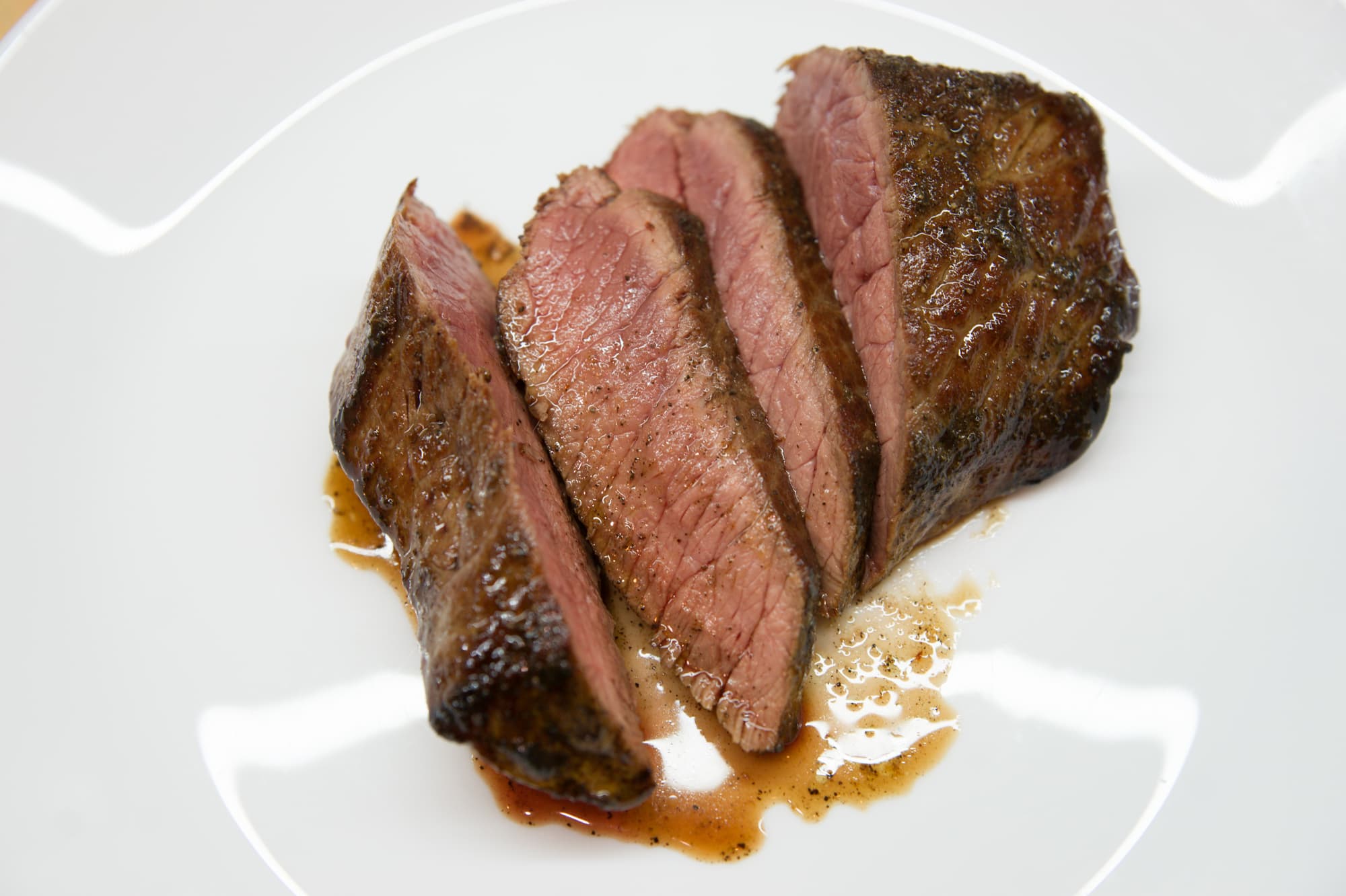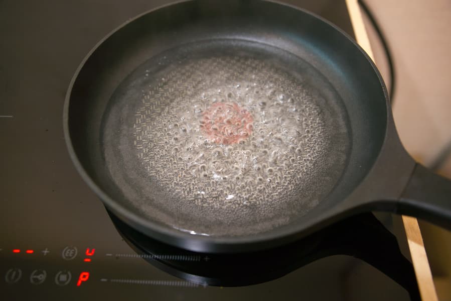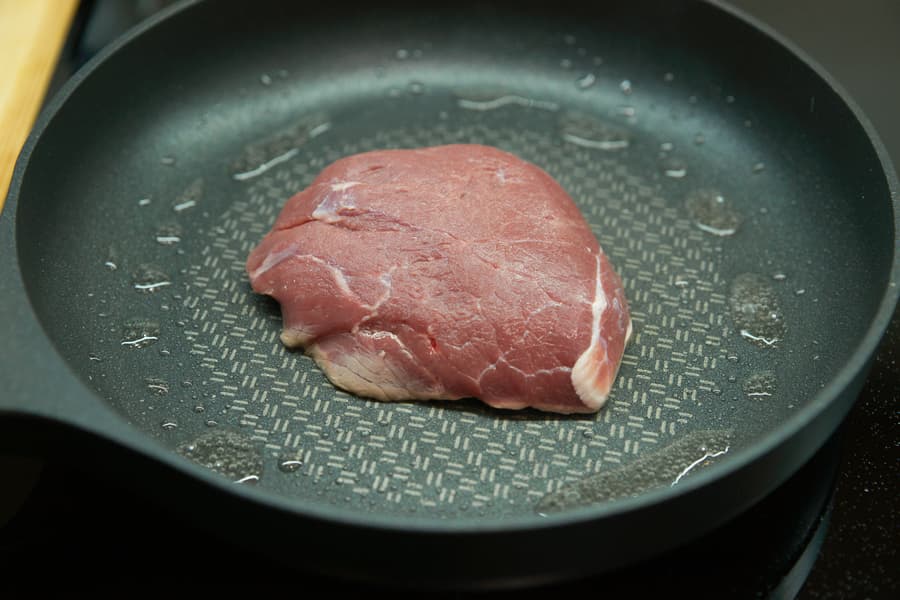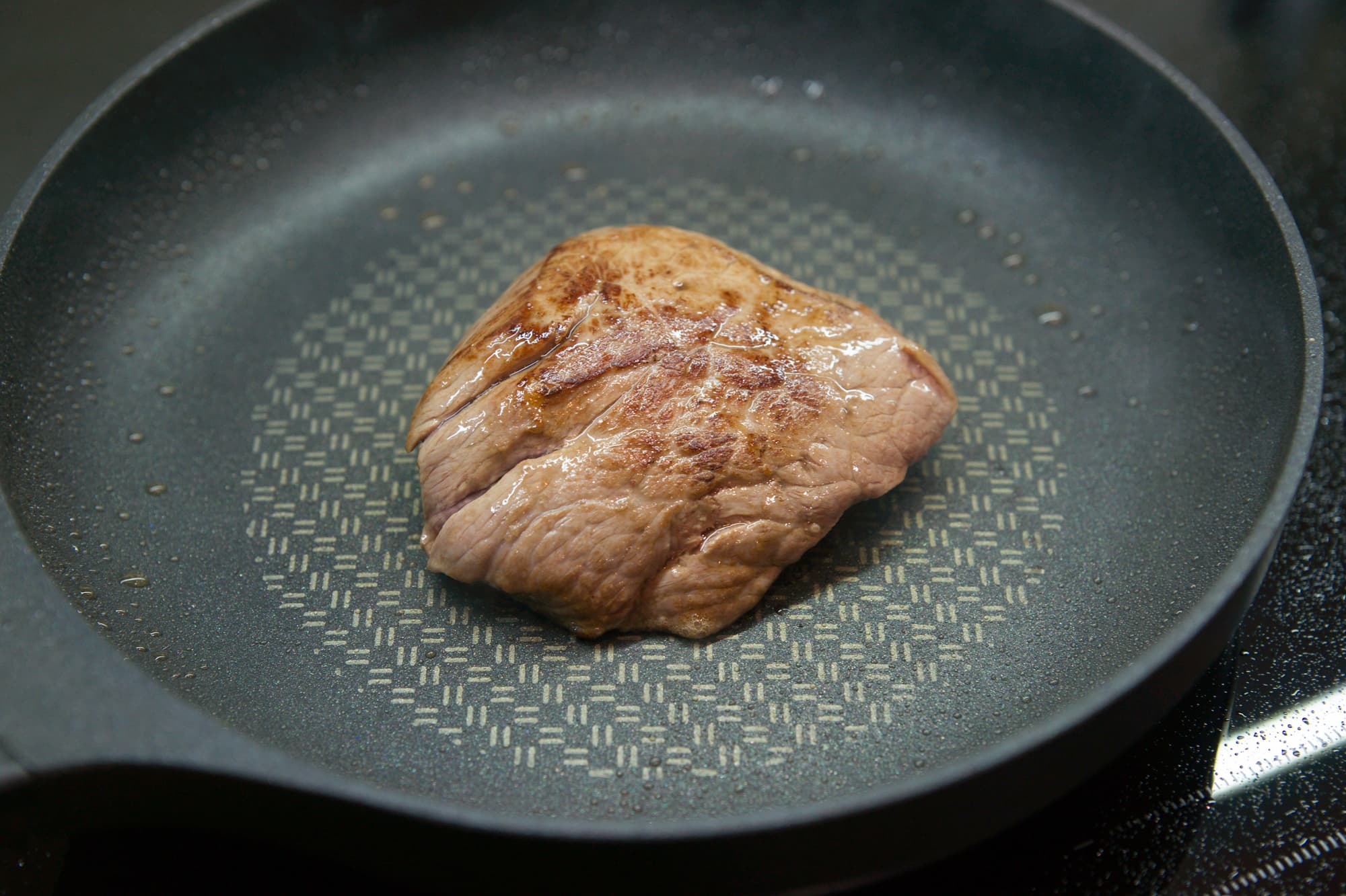 Говяжий стейк комнатной температуры обжаривали на раскаленной сковороде на самой большой и, как мы выяснили при измерениях, самой мощной зоне нагрева.