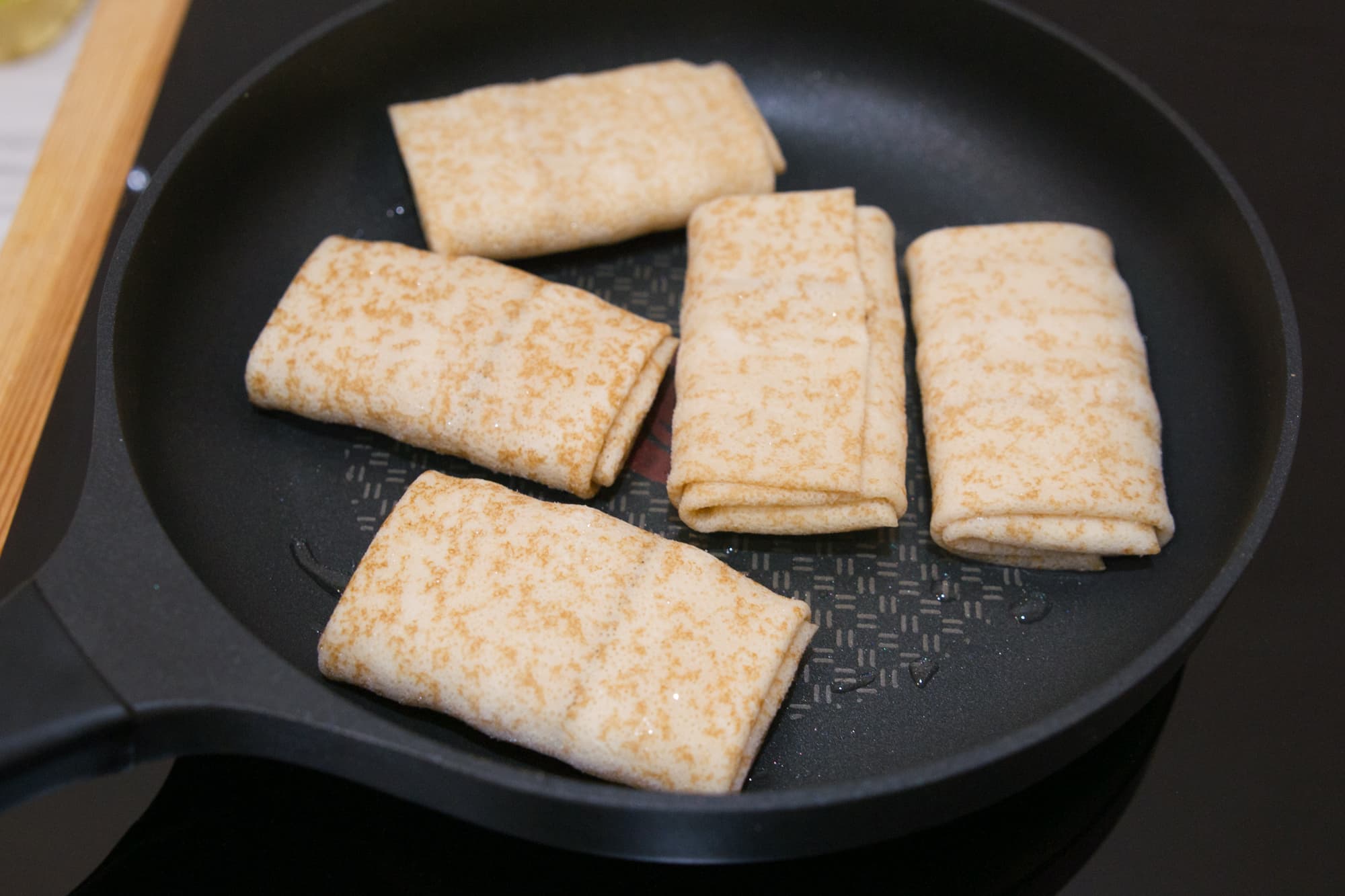 Начинка из творога отлично прогрелась, обжаривание получилось равномерным — в центре сковороды блинчик не подгорел, а по краям изделия не остались бледными. Менять блинчики местами в процессе не пришлось.