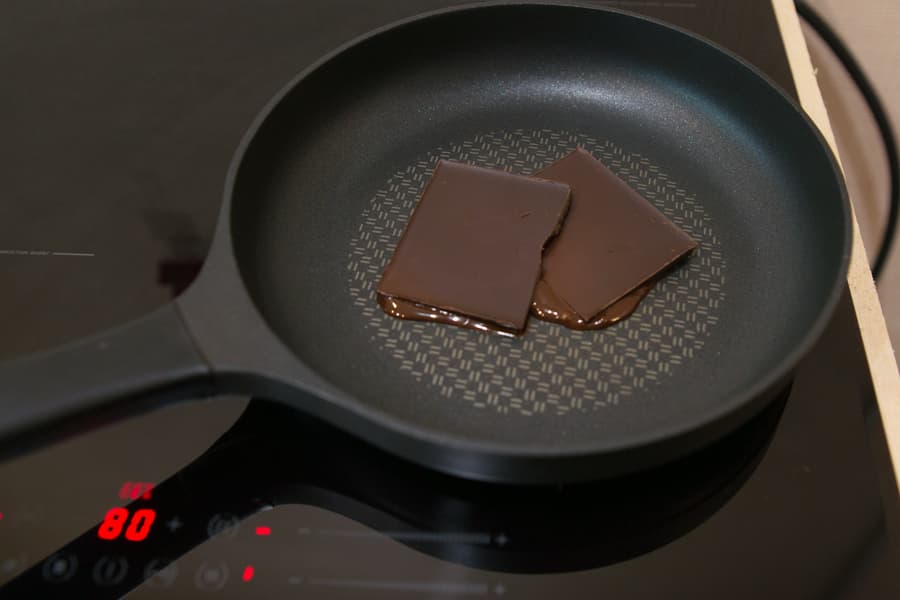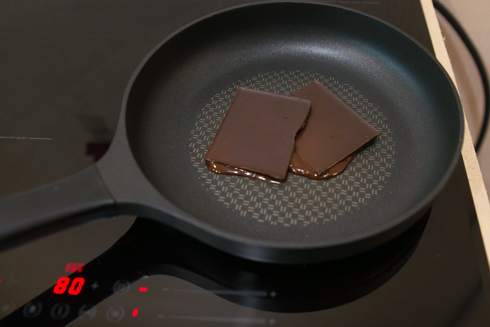 70 г горького шоколада с содержанием какао 75% положили на дно сковороды с толстым дном и включили режим Фондю.