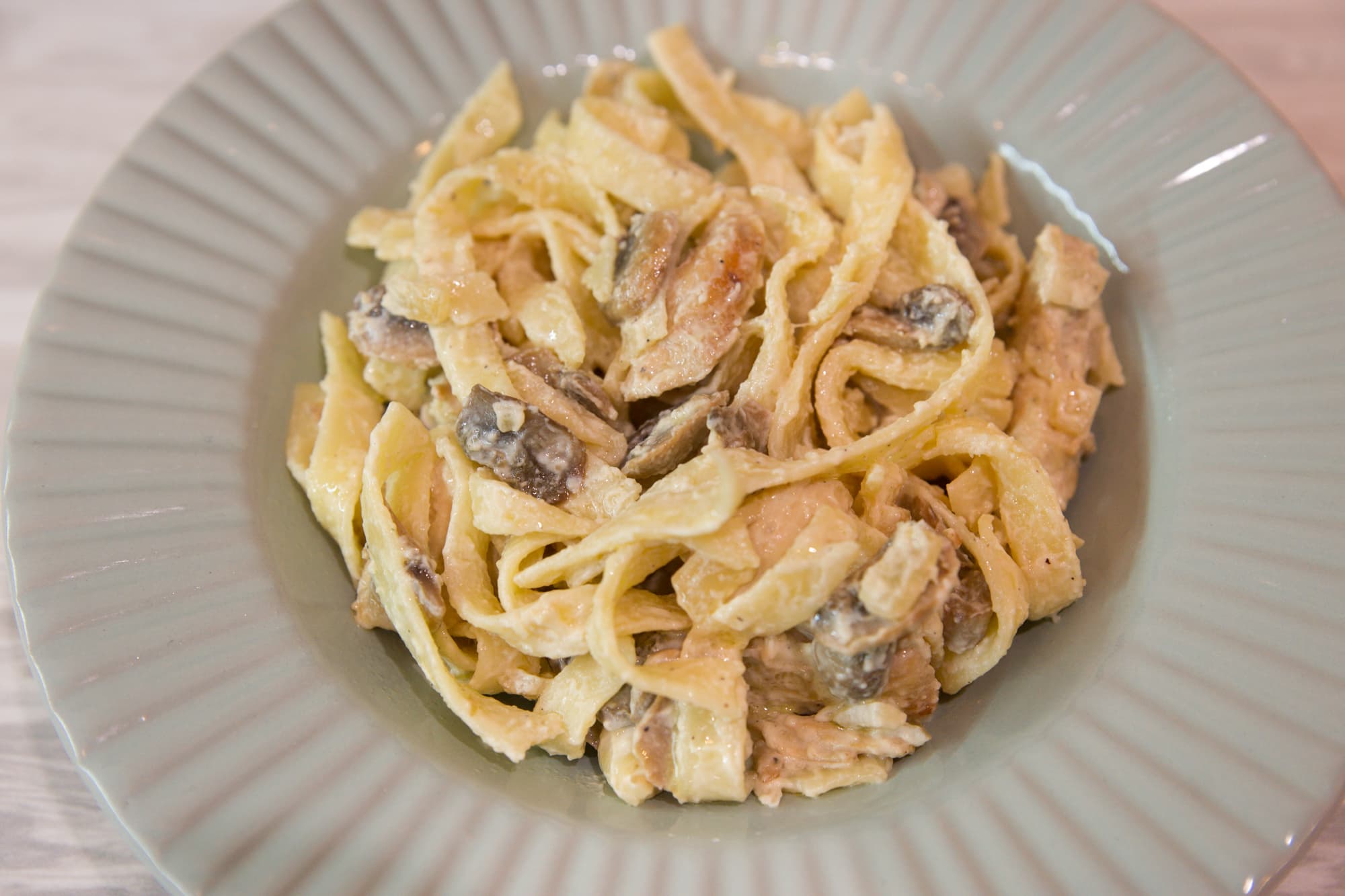 Ингредиенты: паста тальятелле — 400 г, куриная грудка — 300 г, шампиньоны — 300 г, одна небольшая луковица, сливки 33% — 200 мл, твердый сыр — 100 г, оливковое масло для жарки, соль и черный молотый перец — по вкусу