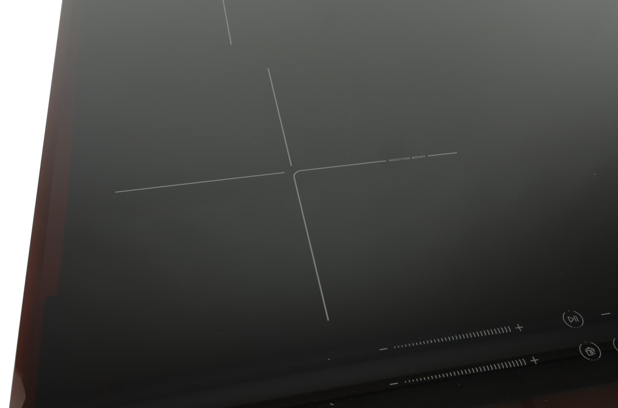 На идеально гладкой поверхности глубокого черного цвета выделены четыре зоны нагрева, в нижней части посередине привычно расположена сенсорная панель управления, а в крайнем правом углу — фирменный логотип.