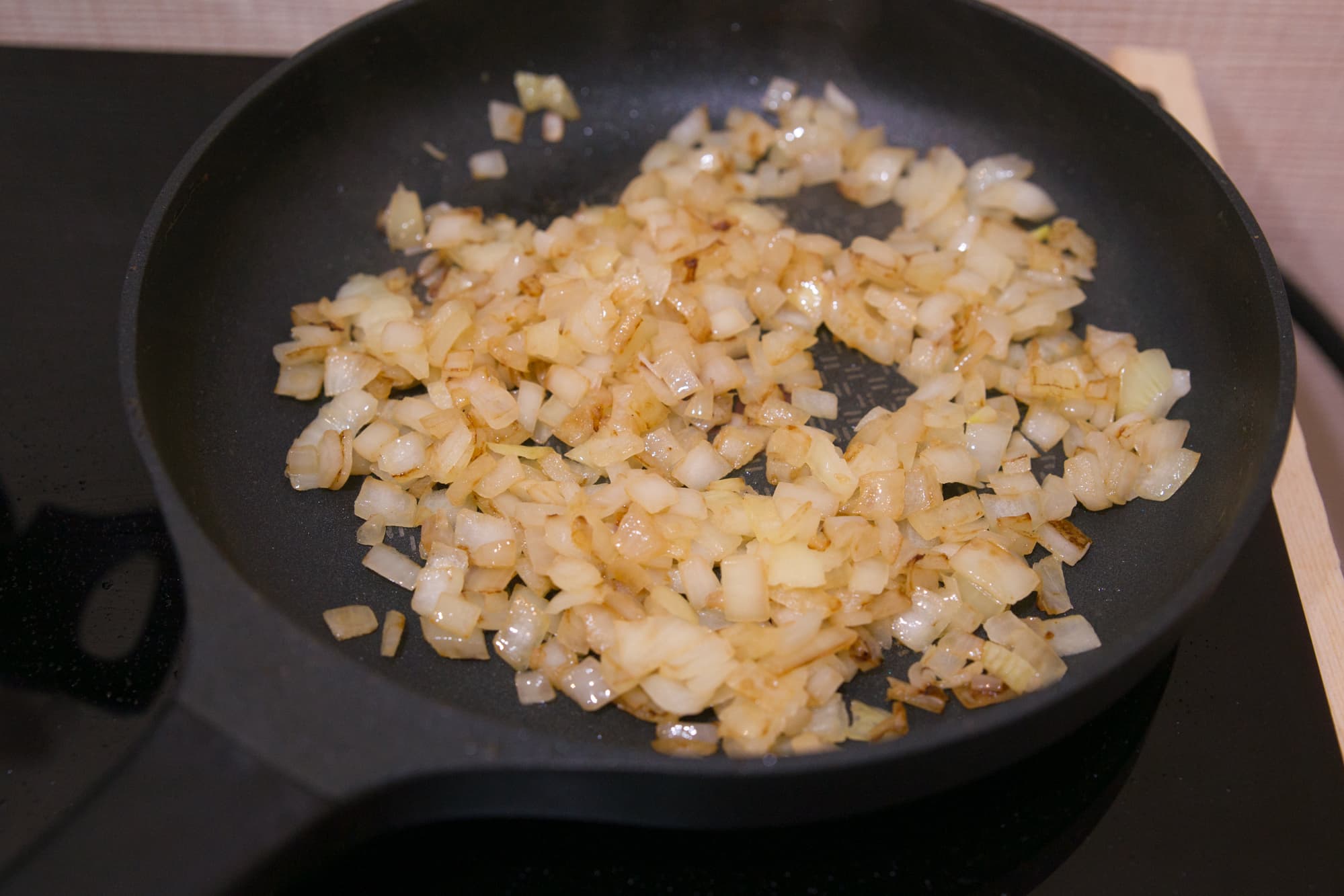 Обжарили лук, добавили к нему консервированные нарезанные кубиками помидоры без шкурки в собственном соку и несколько измельченных зубчиков чеснока. Присыпали содержимое сковороды солидной порцией хмели-сунели, посолили, перемешали и оставили тушиться под крышкой на 5-й мощности.
