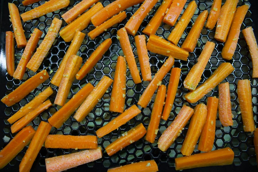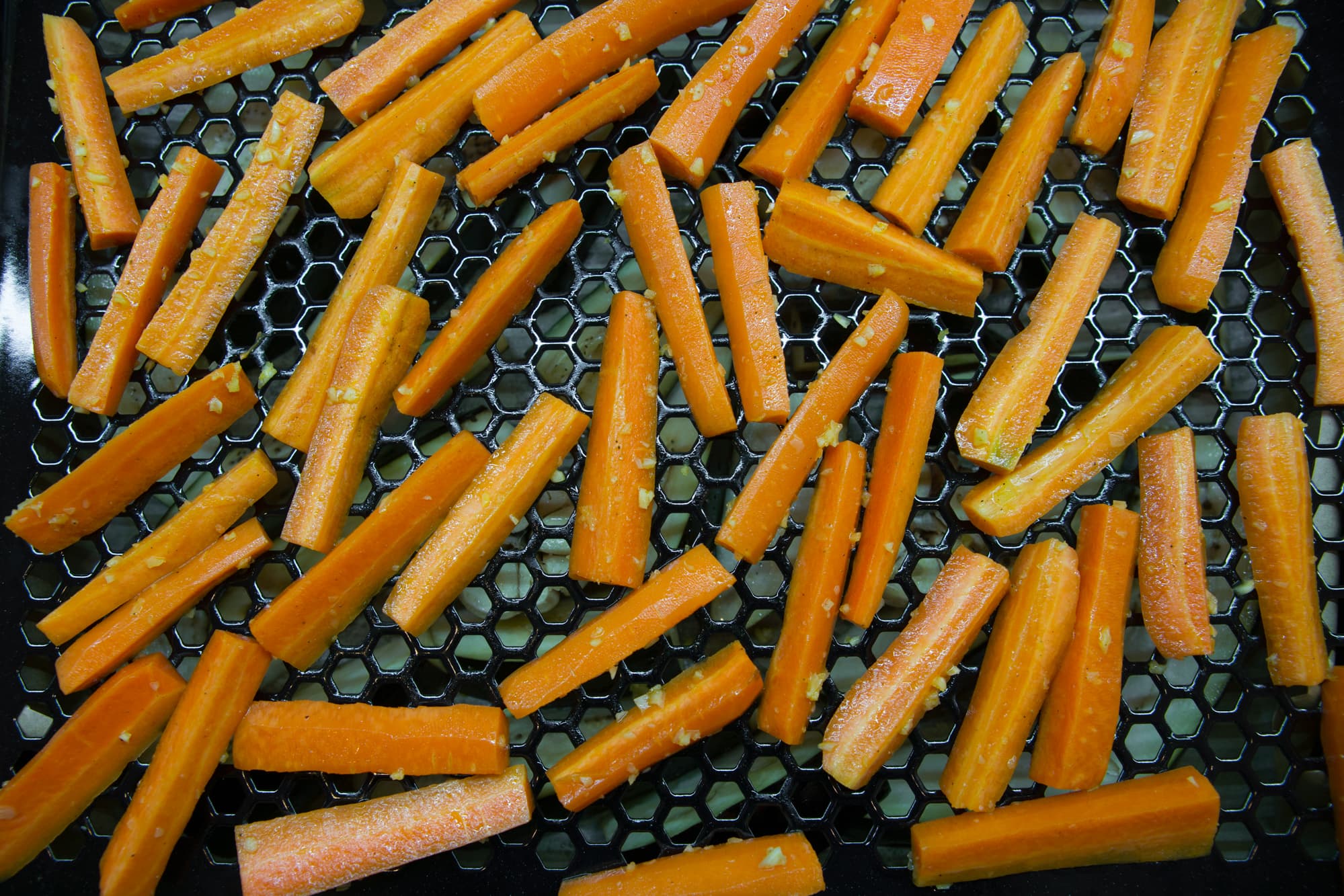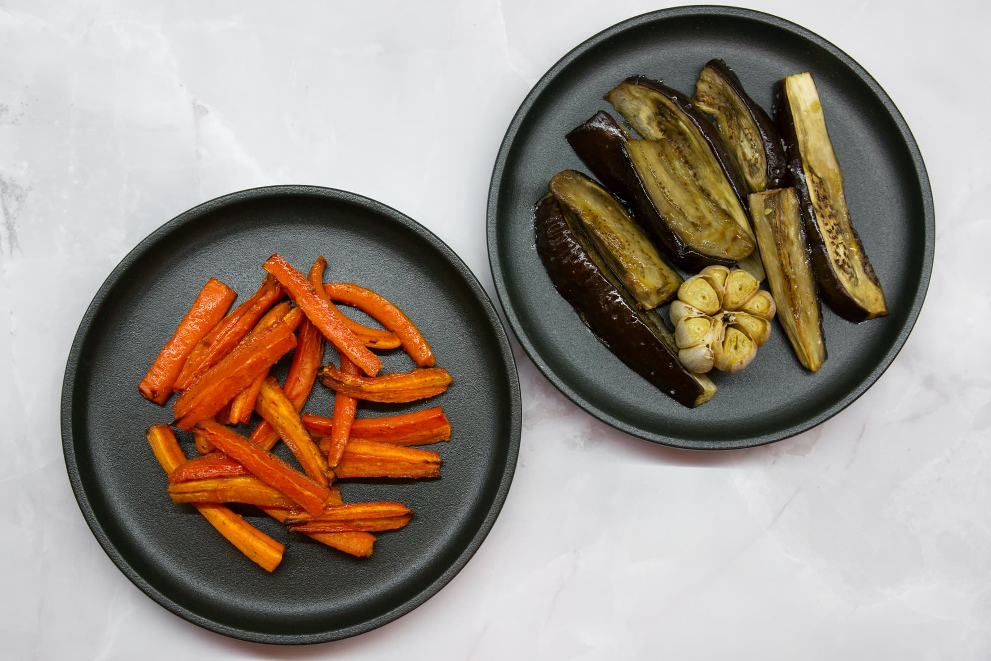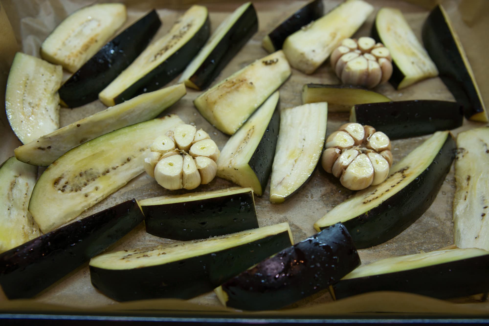 На противень с баклажанами и чесноком поставили предварительно смазанный маслом противень Fryart с морковью и разместили их на одном уровне, укрыв фольгой.
