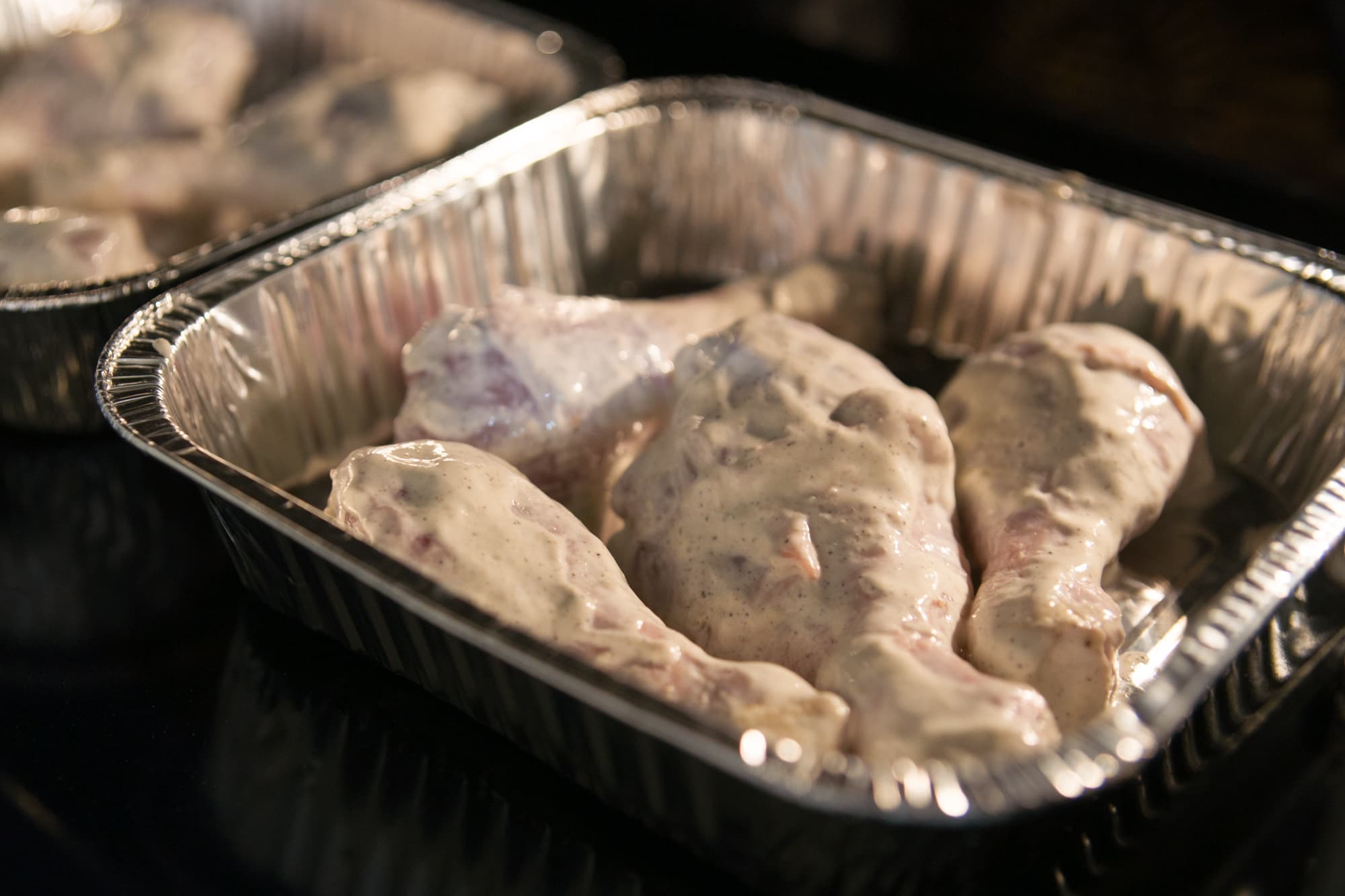 Картофелины покрупнее разрезали на две/четыре части, а те, что поменьше, оставили целыми. Посыпали специями с солью, добавили растительное масло и перемешали. Куриные ножки на час замариновали в сметане с сухим чесноком, солью и молотым перцем.
