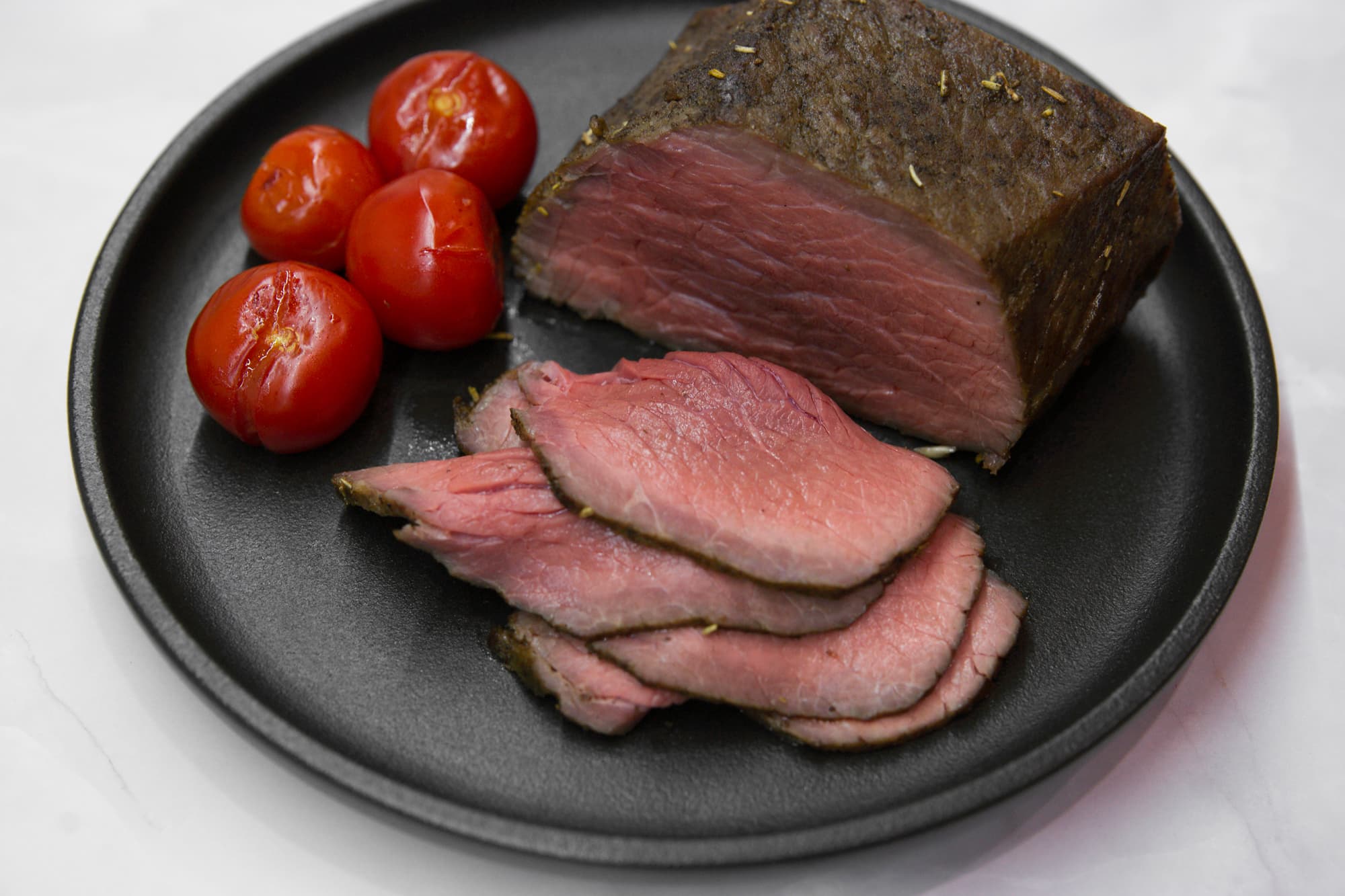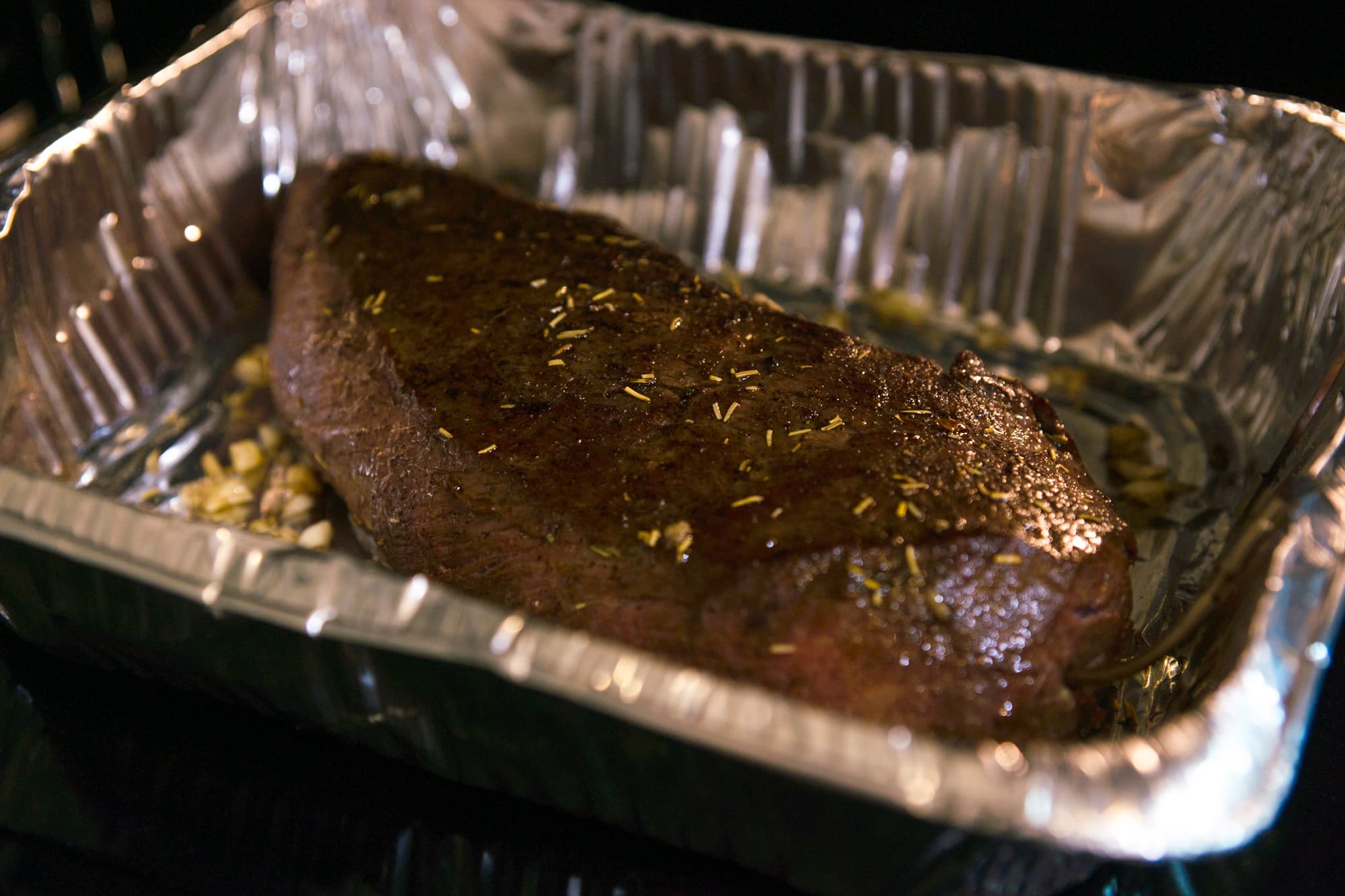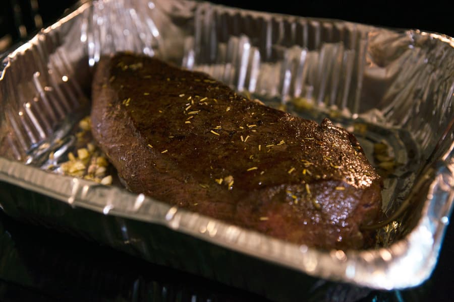 Форму мы не накрывали, в середине процесса перевернули мясо для равномерности запекания. Как только раздался сигнал термощупа, достали форму, накрыли ее фольгой и оставили на столе, дав мясу отдохнуть.