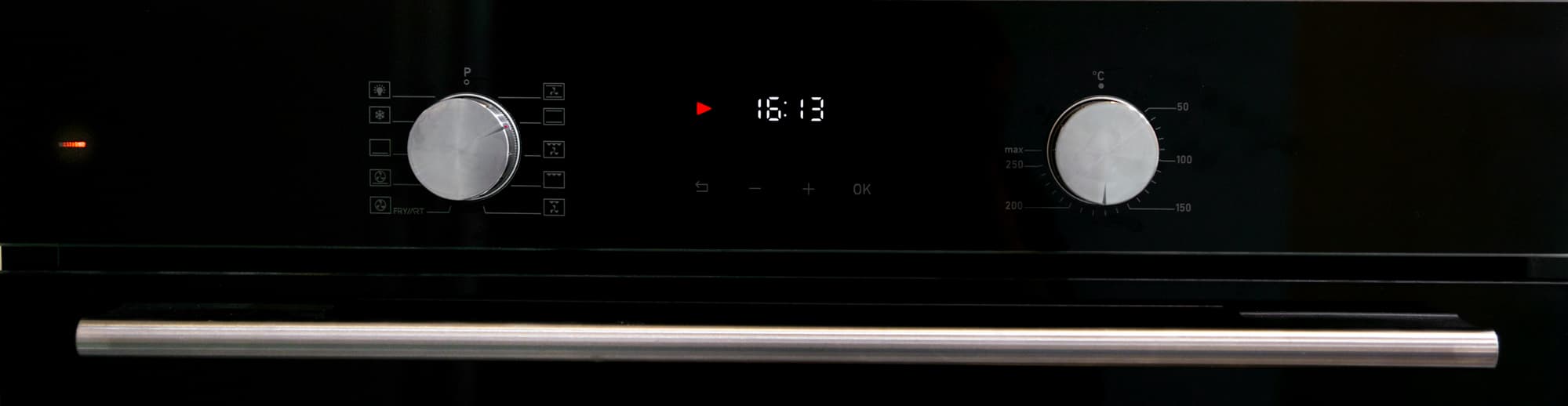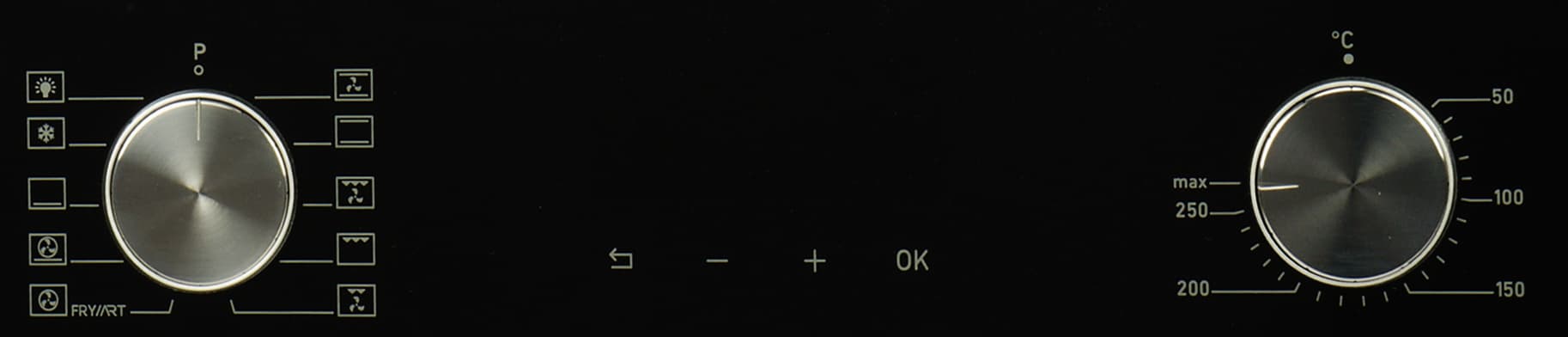 Управление History OE7710C.FBK сосредоточено в верхней части лицевой панели и состоит из двух утапливаемых ручек — переключателя режимов и регулятора температуры, и четырех сенсорных кнопок — кнопок уменьшения и увеличения заданных параметров, кнопки подтверждения и кнопки возврата/отмены заданных параметров.