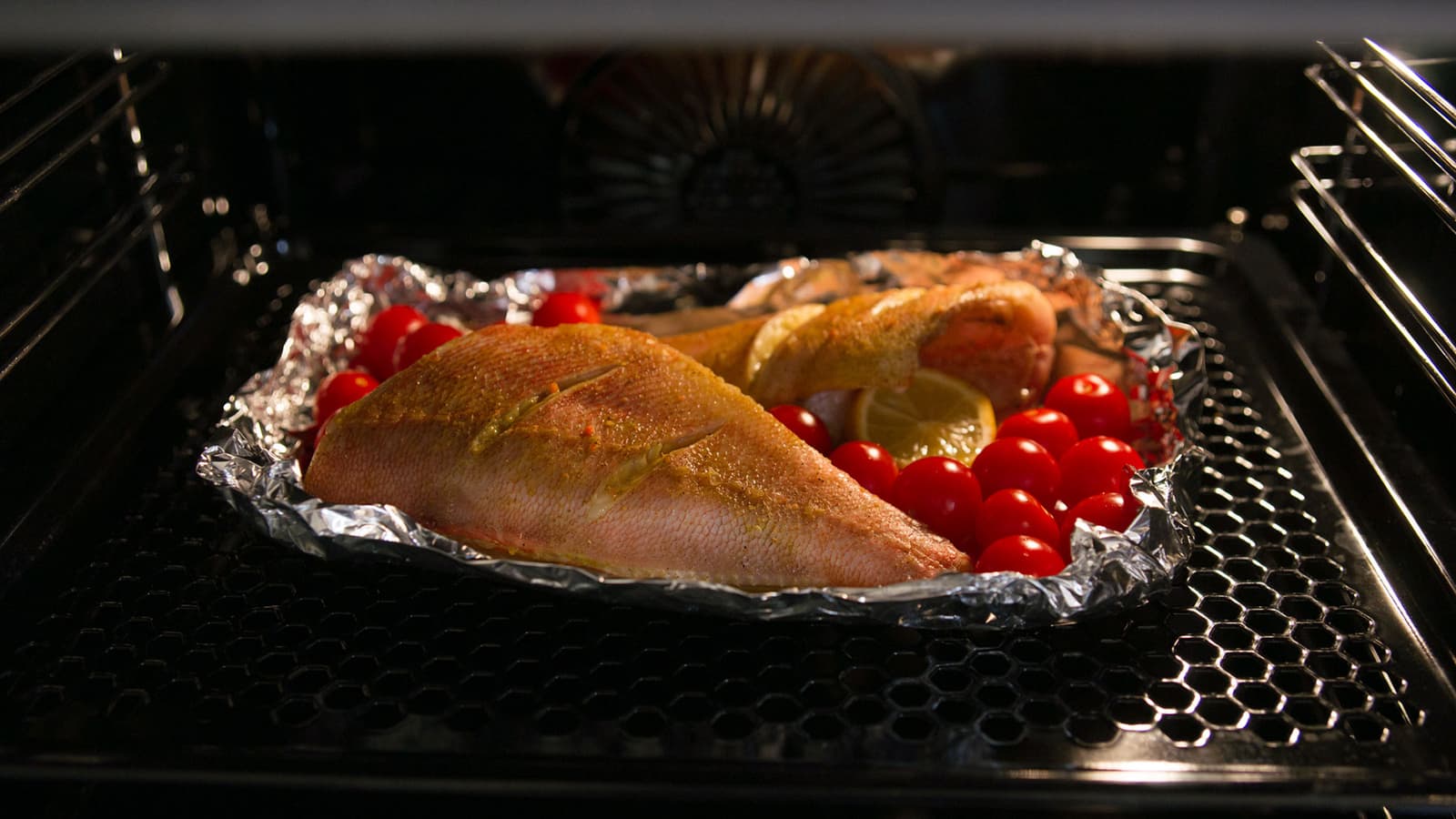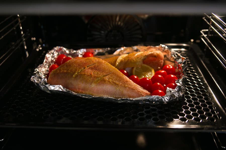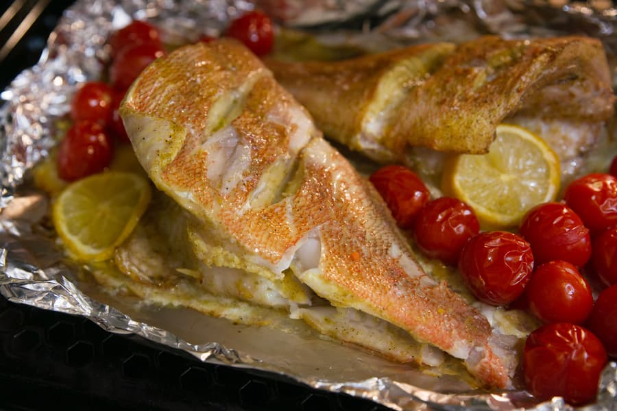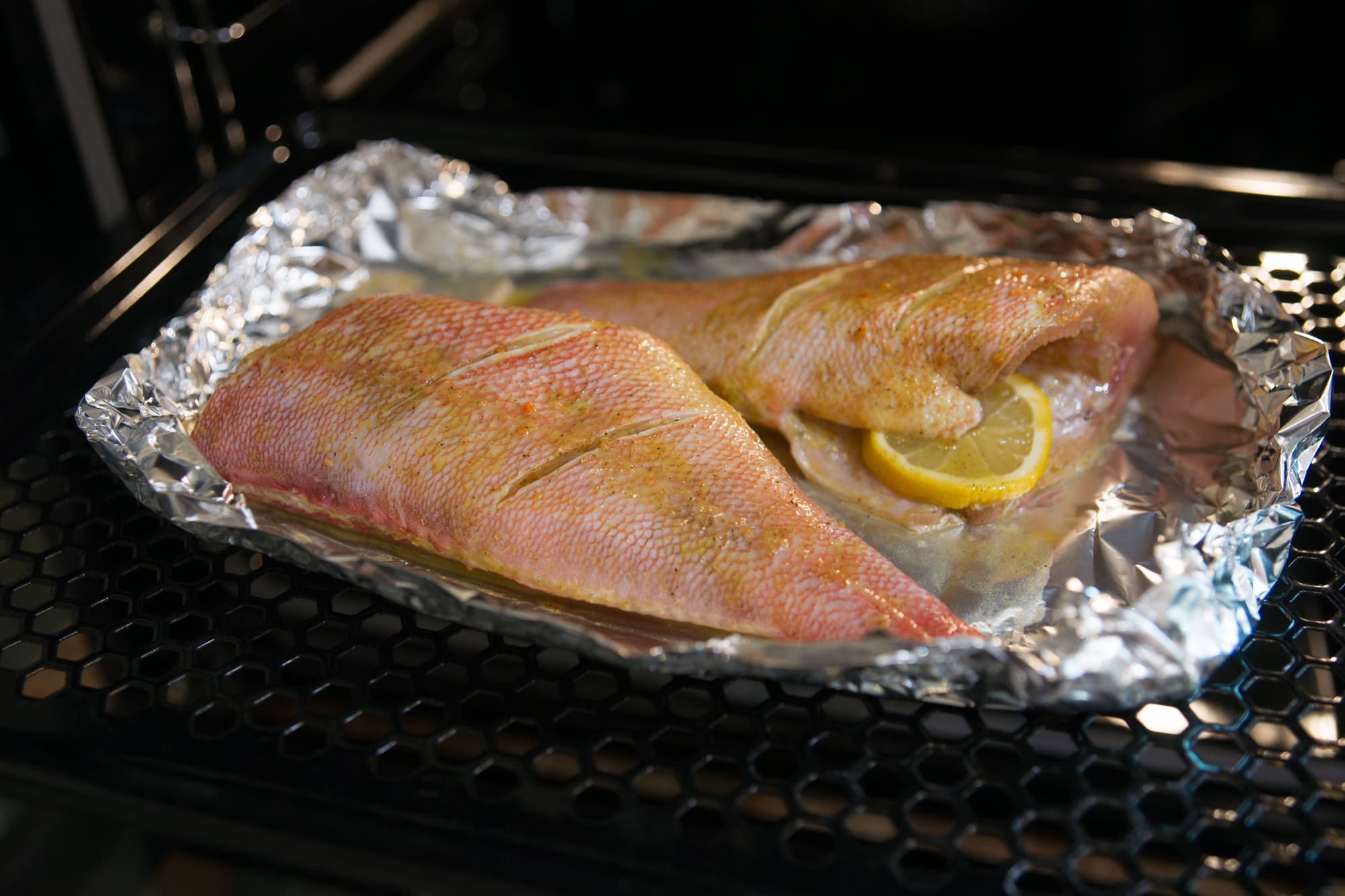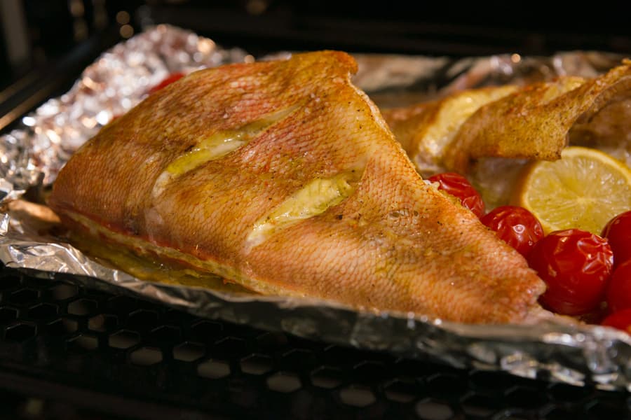 Рыбу в процессе мы не переворачивали, но благодаря перфорации в противне это не помешало кожице снизу не потушиться, а именно хорошо запечься. Даже несмотря на то что, вопреки рекомендациям, полноценному обдуву препятствовал слой фольги.