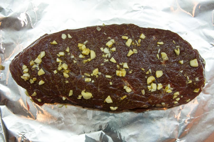 Для первого теста мы взяли кусок филейной части говяжьей туши весом почти полтора килограмма. Смазали мясо оливковым маслом, натерли смесью соли, сухого розмарина и тимьяна, густо присыпали черным молотым перцем, растерли его по поверхности куска со всех сторон и вдавливающими движениями, также со всех сторон распределили крупно нарезанный чеснок. Всю эту ароматную красоту замотали в фольгу и оставили при комнатной температуре примерно на час.