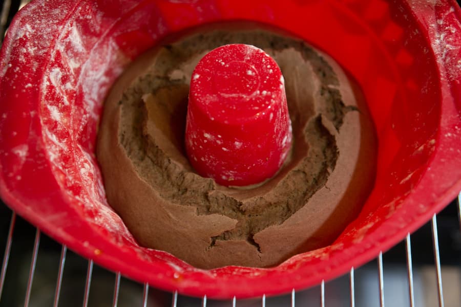Вылили тесто в форму, поместили ее на решетку, закрыли дверцу и приготовились наблюдать, благо достаточная степень прозрачности окошка этому способствует. Через 40 минут, ориентируясь на внешний вид изделия, мы отключили духовку и достали емкость.