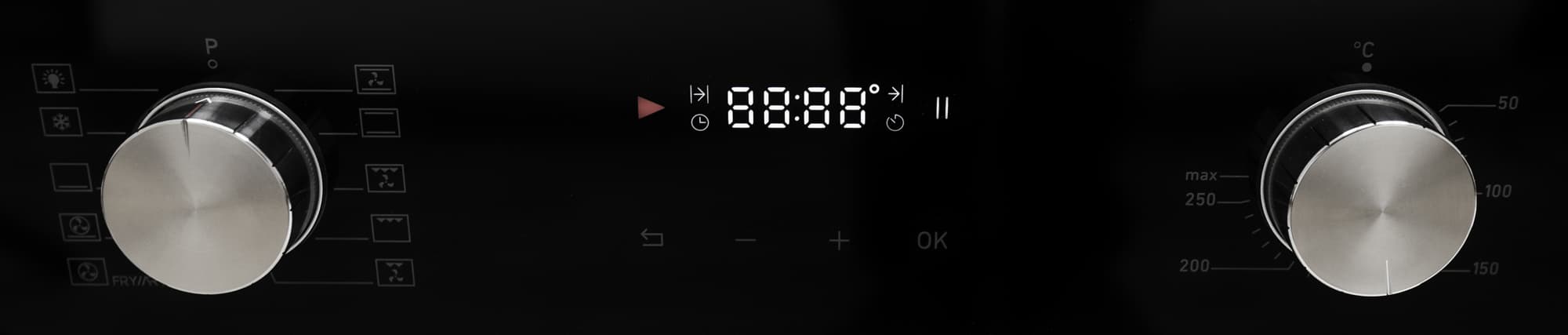 С помощью таймера и кнопок задается время работы прибора, настраивается функция отложенного старта и устанавливается текущее время на часах. При отключении электричества часы сбрасываются и в случае возобновления подачи электроэнергии показывают «обнуленное» время. Без настройки часов духовка не запускается.