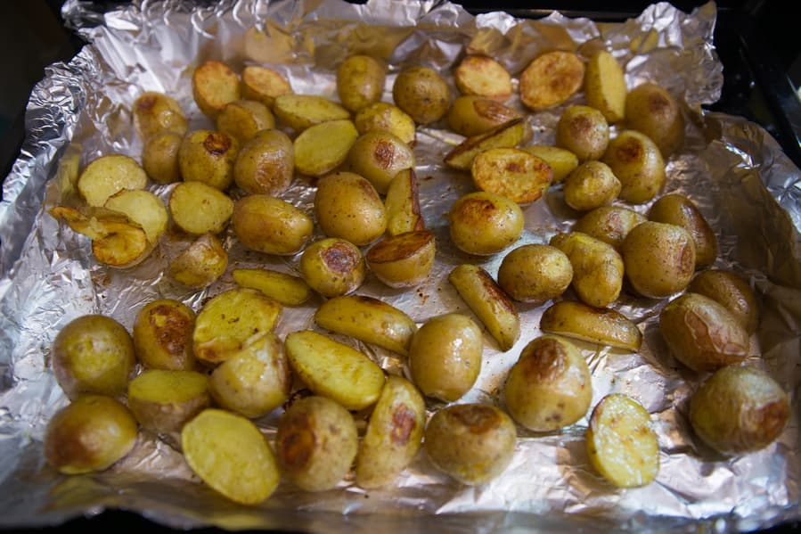 Духовка нагрелась до 180 °C в режиме верх+низ с конвекцией. На нижний противень разложили 1,5 кг картофеля.