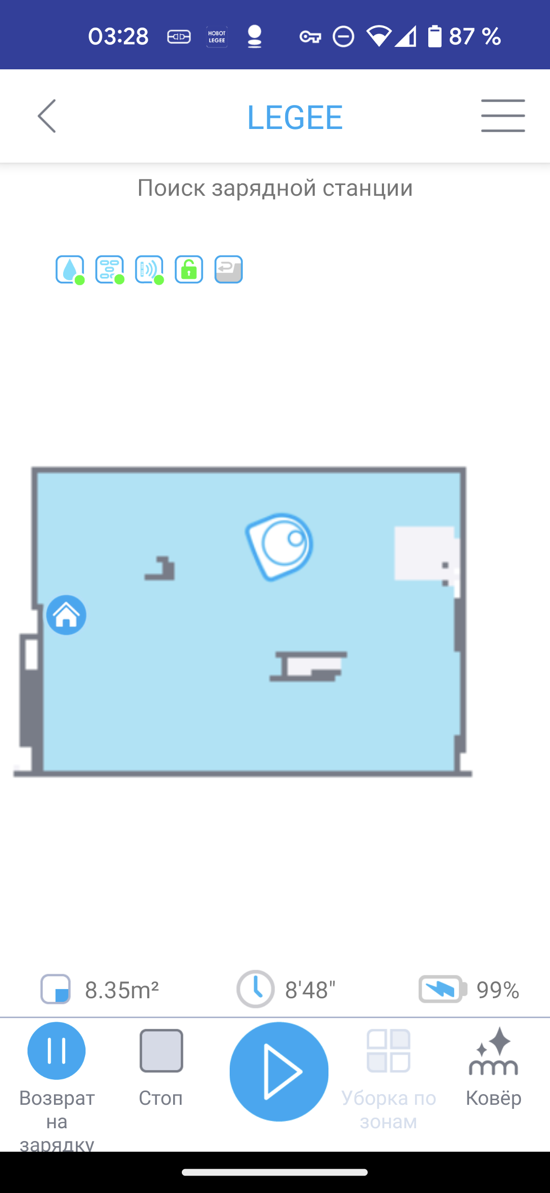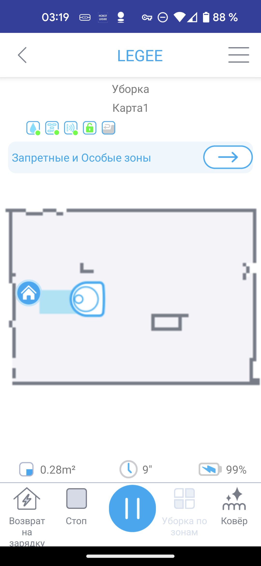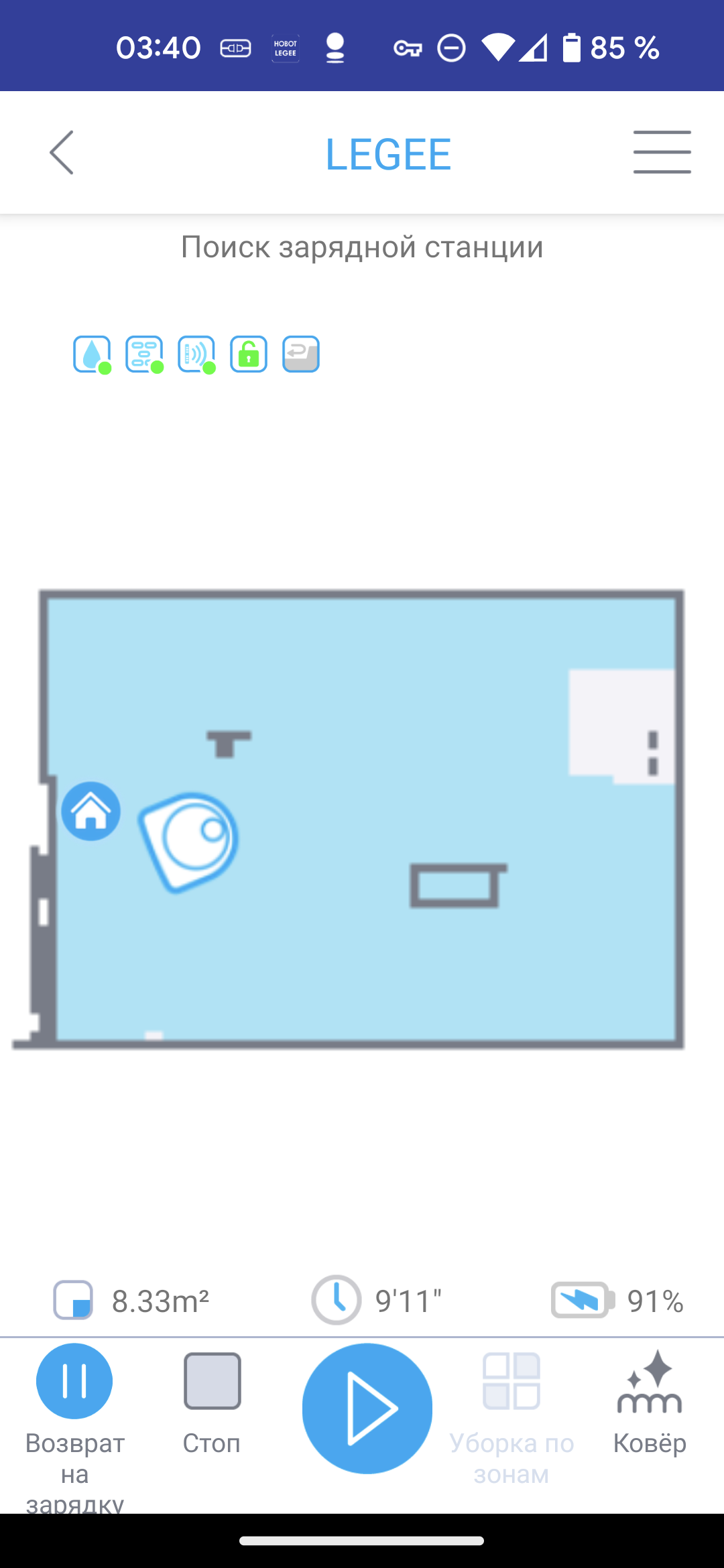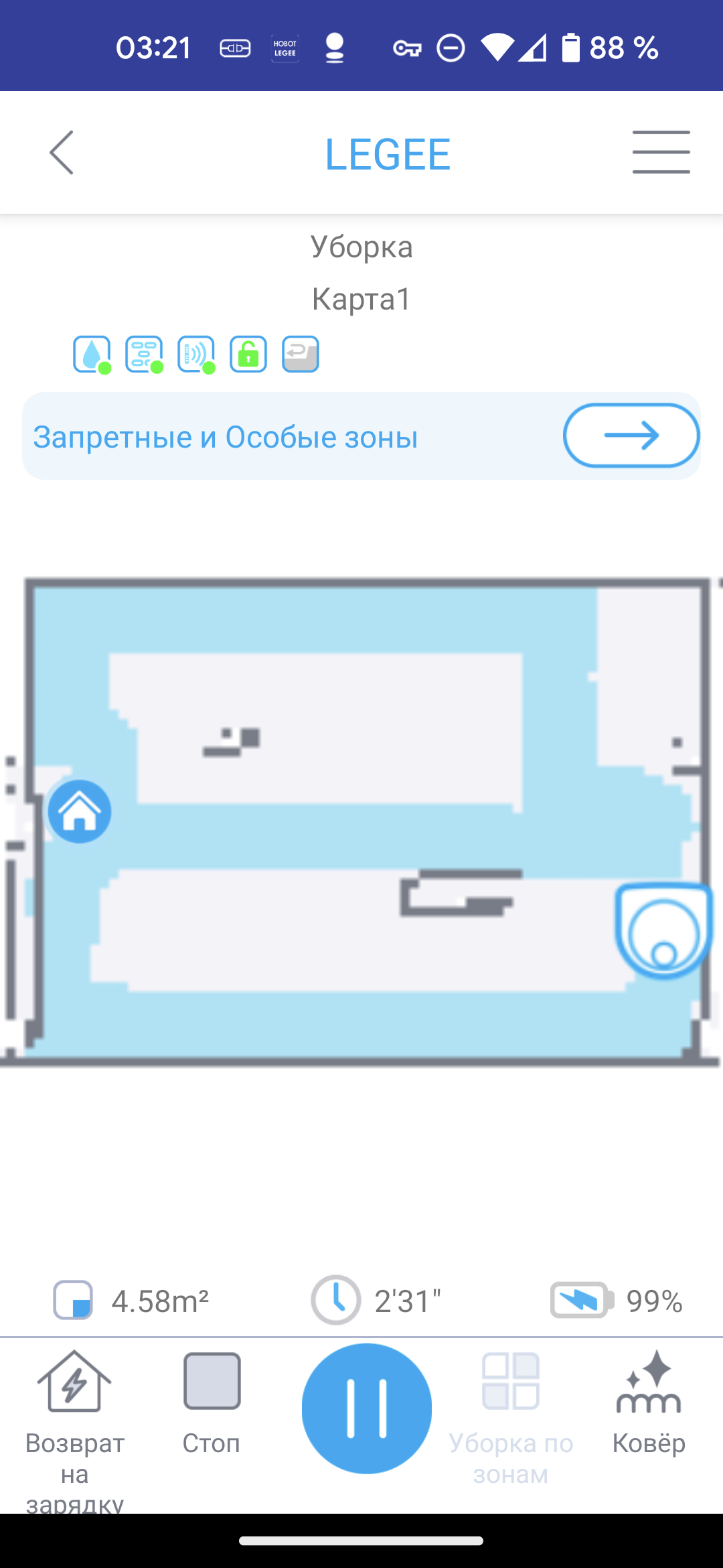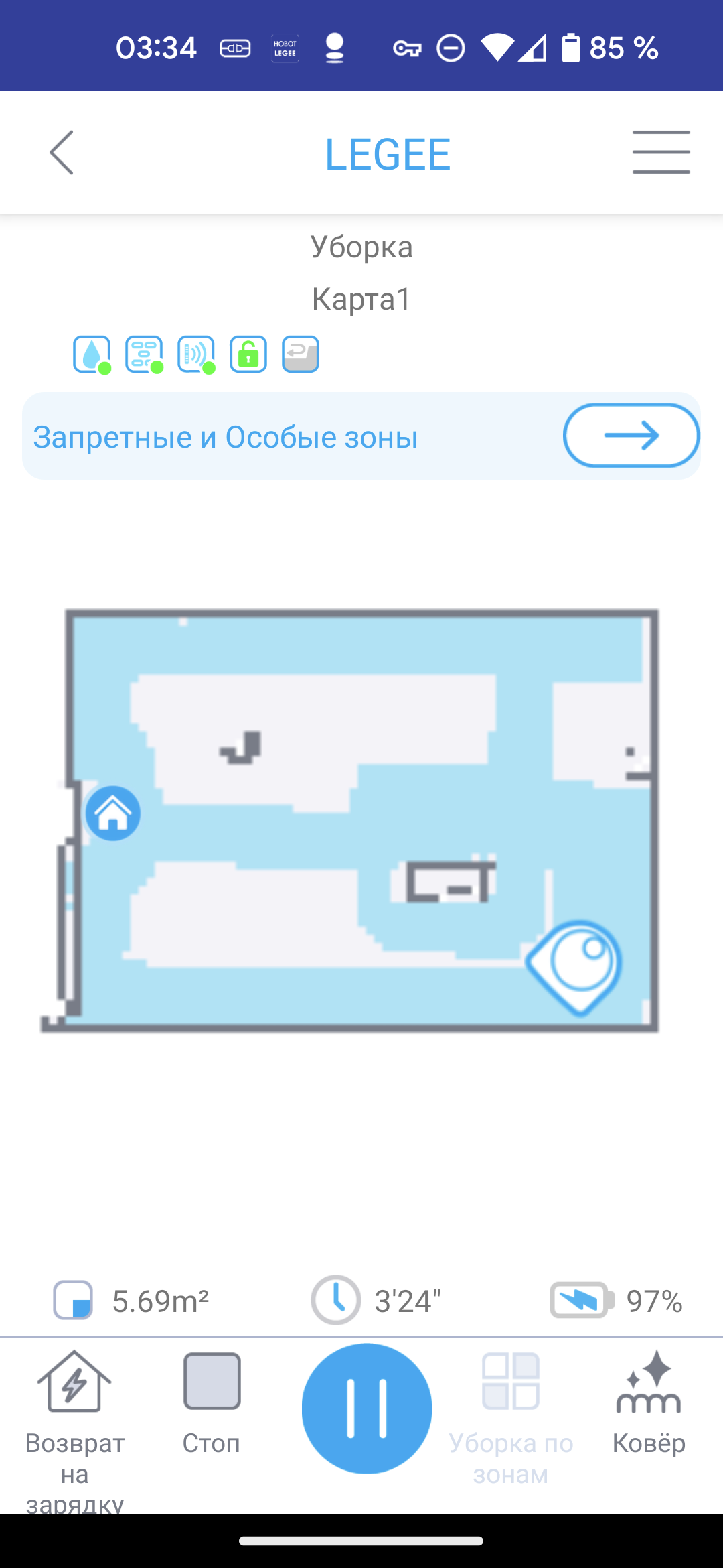 - В режиме «Ковер» снижается скорость движения робота, а турбощетка вращается с высокой скоростью. Такой алгоритм позволяет достичь оптимального качества уборки мягких покрытий.