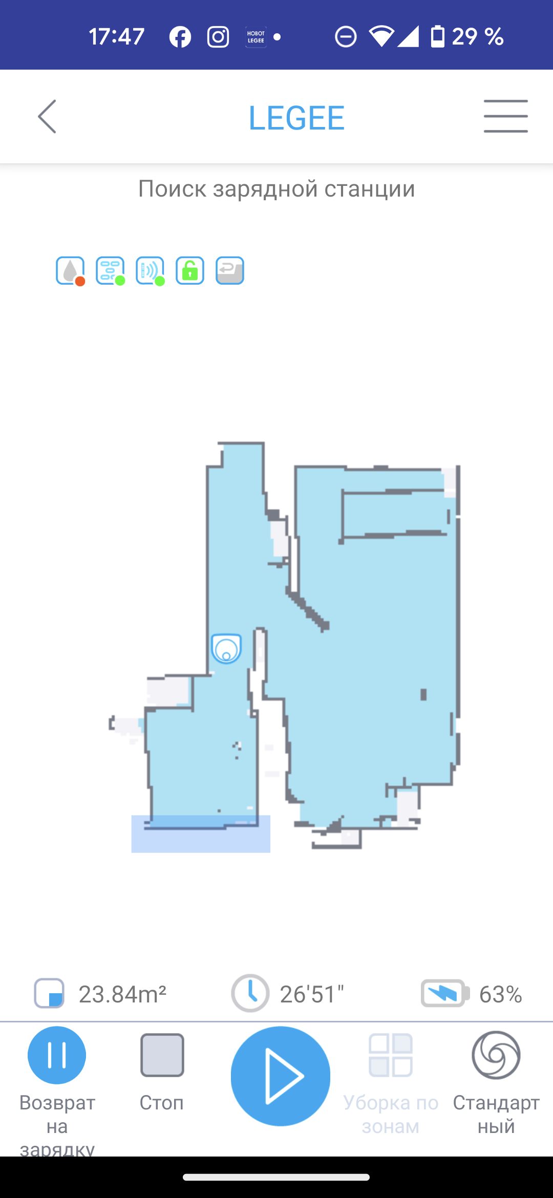 Оказавшись в знакомом помещении, наш робот в стандартном режиме обходит его покомнатно — сначала по периметру, а затем «змейкой» — до тех пор, пока не закончит уборку.