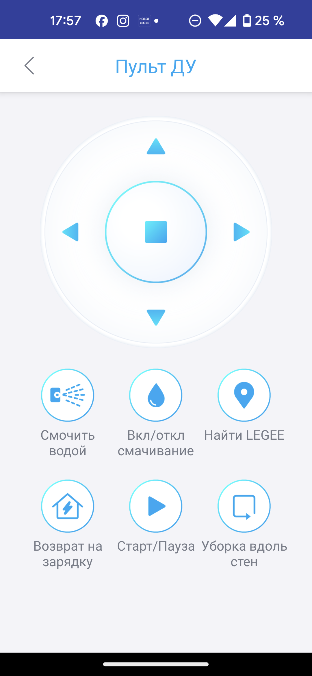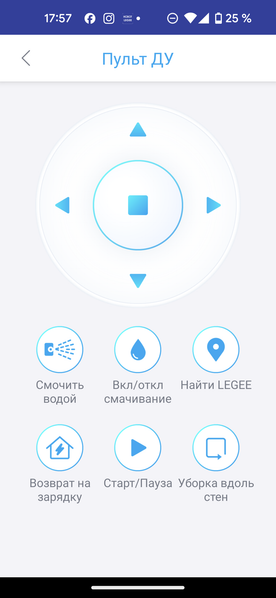 Раздел «Пульт ДУ» превращает экран приложения в пульт дистанционного управления. Здесь можно вручную задать маршрут движения, активировать уборку вдоль стен или возвращение на зарядку, настроить интенсивность увлажнения или отключить влажную уборку.