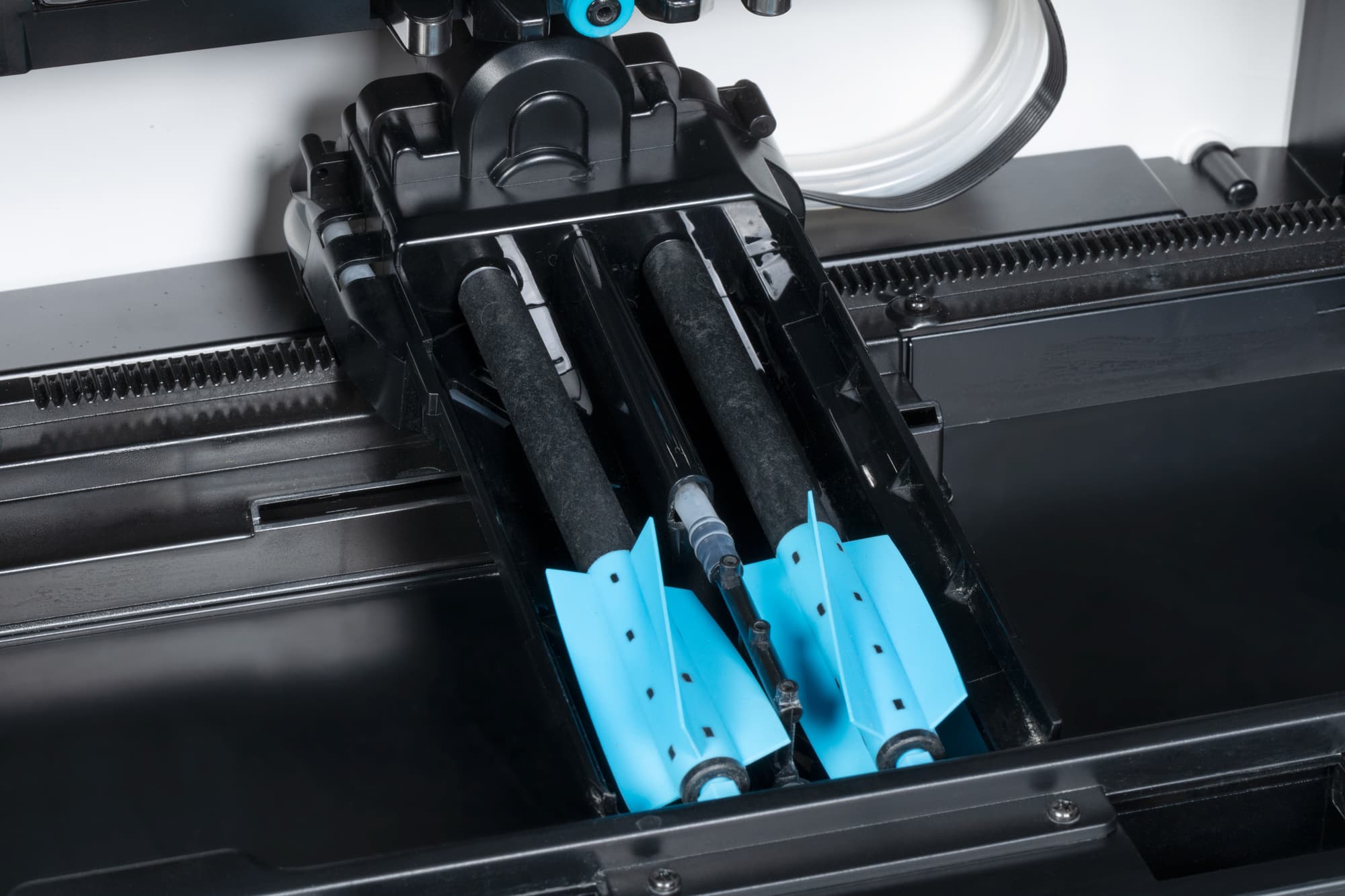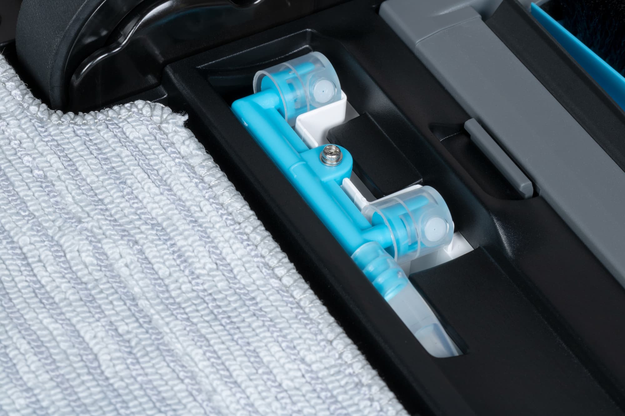 За смачивание напольного покрытия отвечают четыре форсунки голубого цвета, расположенные между центральной щеткой и салфеткой. Такая система позволяет более гибко управлять расходом воды и облегчает конструкцию подвижной швабры.