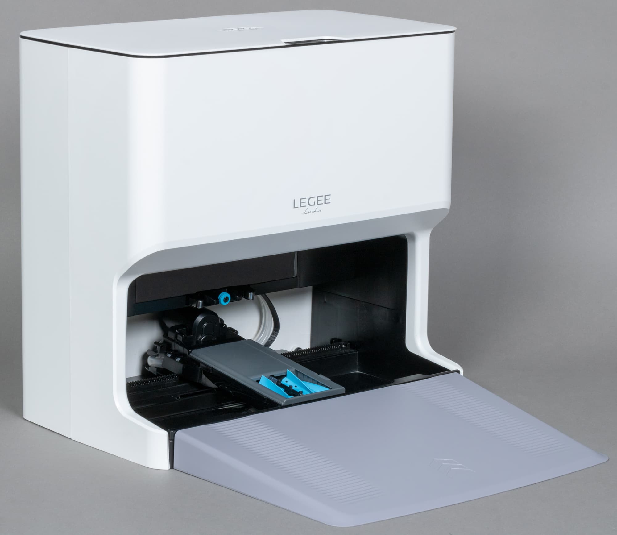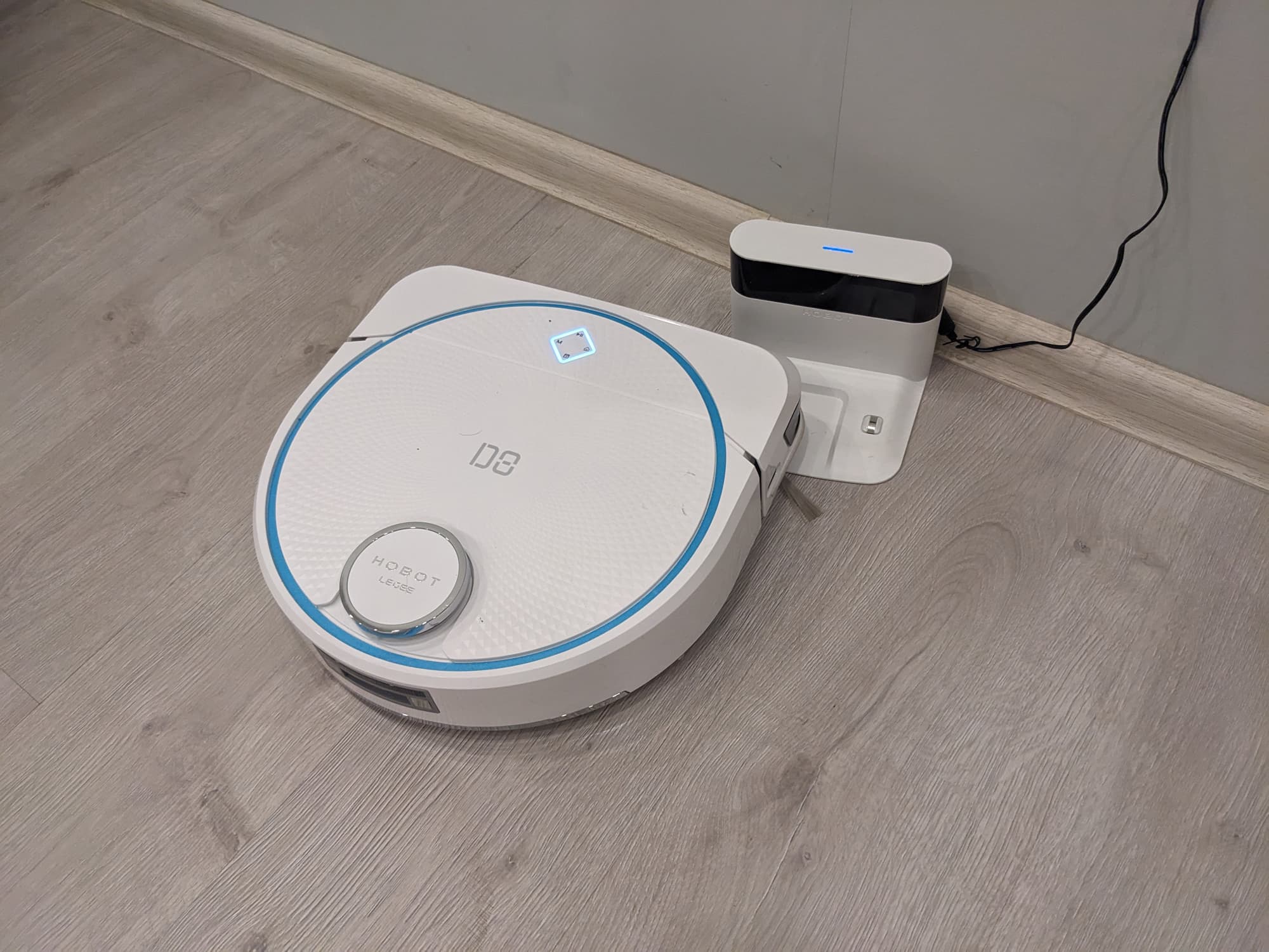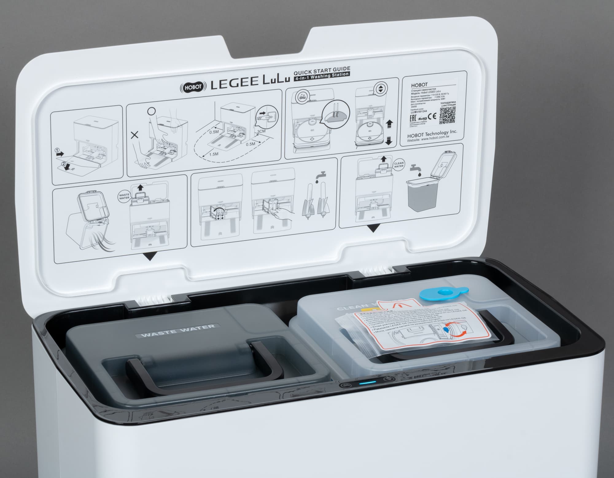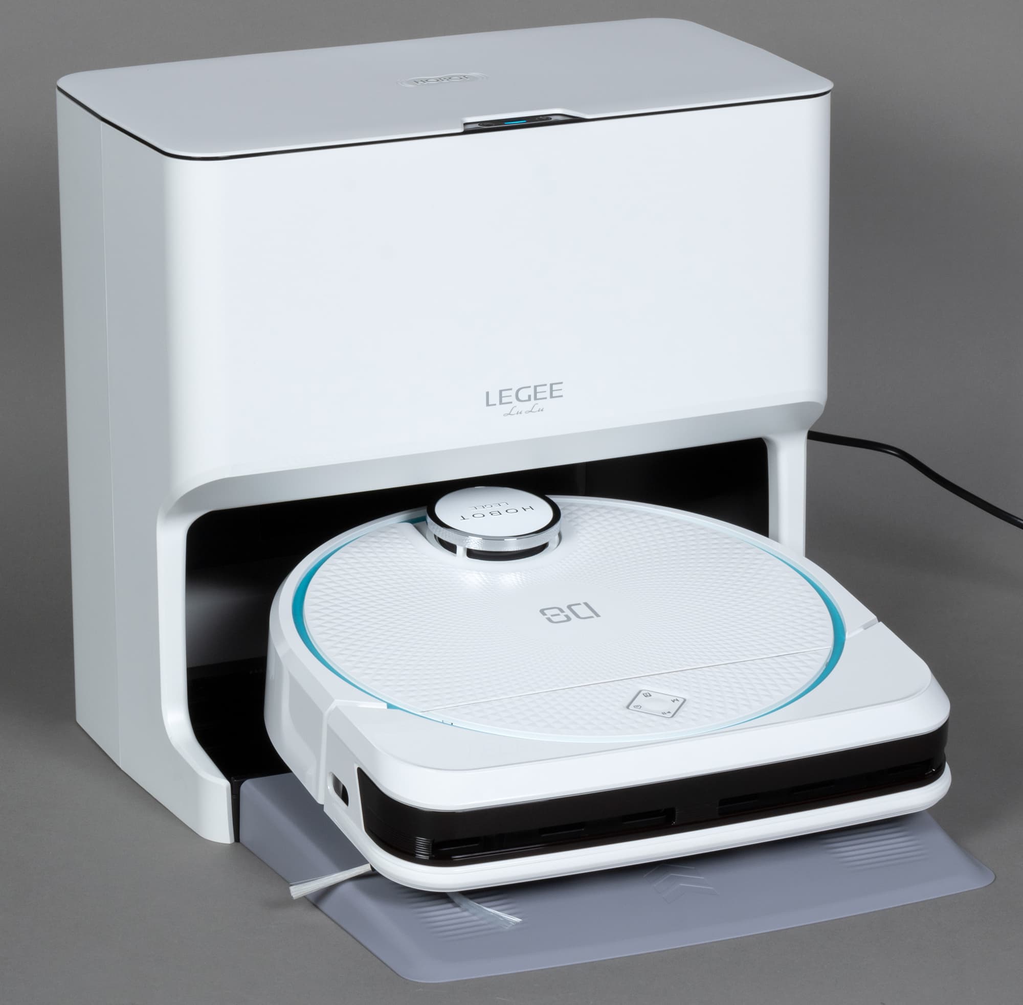 Станция Hobot Legee LuLu обеспечивает зарядку робота, заправляет его чистой водой, стирает салфетки с помощью подвижного модуля, после чего сушит швабру потоком теплого воздуха. Это позволяет программировать влажную уборку без участия пользователя, от которого требуется только изредка опустошать бак с грязной водой и наполнять резервуар для чистой.