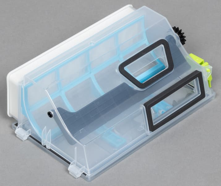 Закончив уборку, робот въезжает на аппарель станции, после чего запускается стирка . Расположенный под салфеткой подвижный модуль промывает салфетку чистой водой, а грязная переливается в предназначенную для нее емкость. Процесс требует времени: стирка занимает до пяти минут.