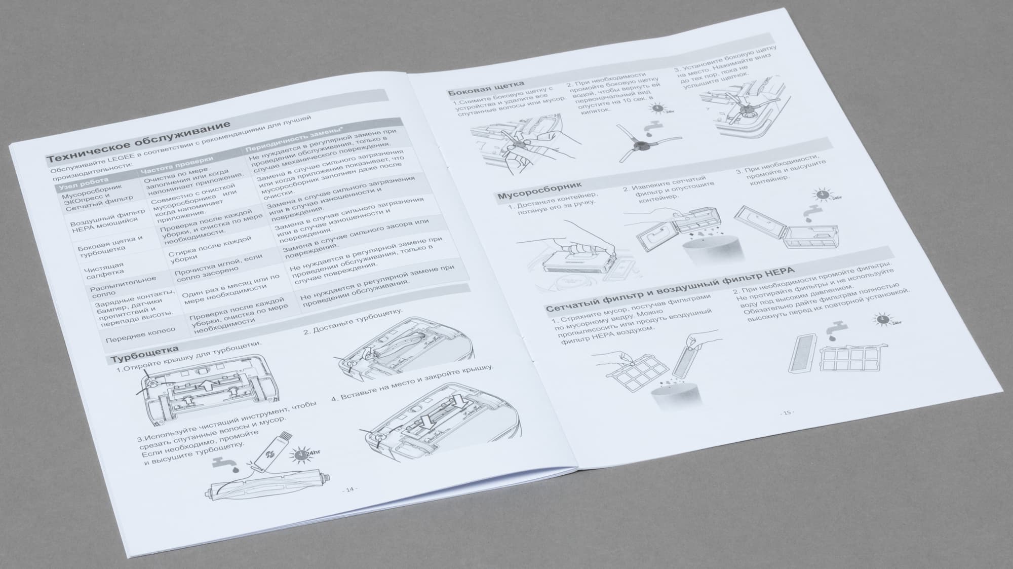 Переднее колесо и гусеничные ленты следует очищать по мере загрязнения. Центральную и боковую щетки требуется время от времени проверять на наличие намотавшихся на роторы ниток, волос и шерсти и при необходимости освобождать с помощью входящего в комплект приспособления.