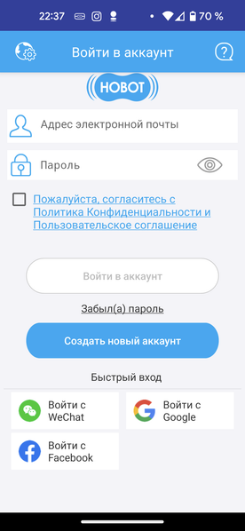 Приложение требует аутентификации. Для управления пылесосом можно создать аккаунт на сервере производителя или воспользоваться входом через WeChat, Google и другие социальные сети.