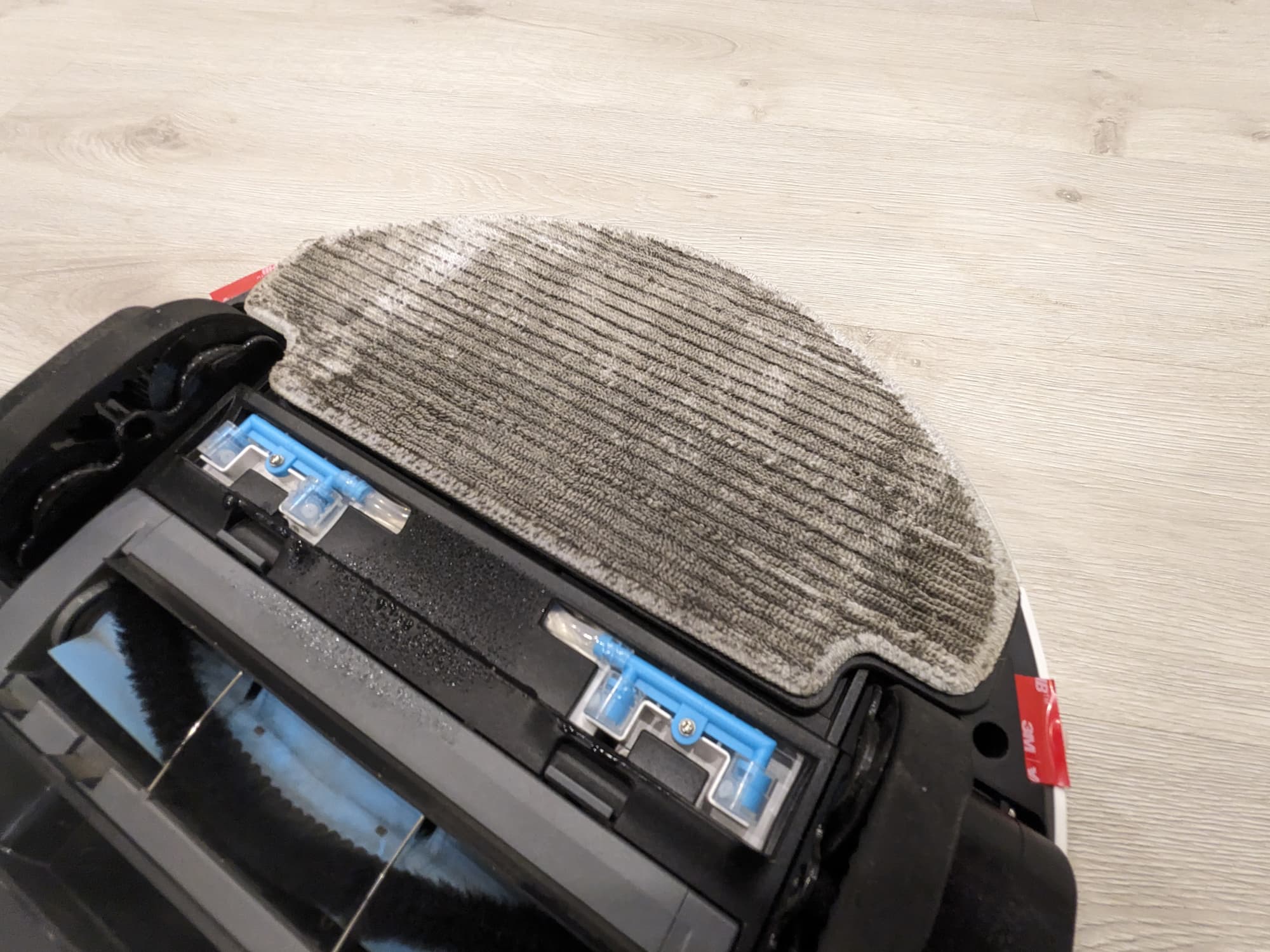 Всю заднюю половину нижней панели занимает D-образная швабра, к которой с помощью липучек-велкро крепятся фибровые салфетки. Она подвижная: в процессе уборки с высокой (до 1300 движений в минуту) вибрирует в направлении вперед-назад, что значительно увеличивает эффективность мытья пола. При преодолении препятствий и въезде на ковровые покрытия конструкция может приподниматься на высоту до 7 мм от поверхности: это улучшает проходимость и предотвращает избыточное смачивание мягких покрытий. При автоматическом распознавании ковра робот, разумеется, отключает и распыление воды.