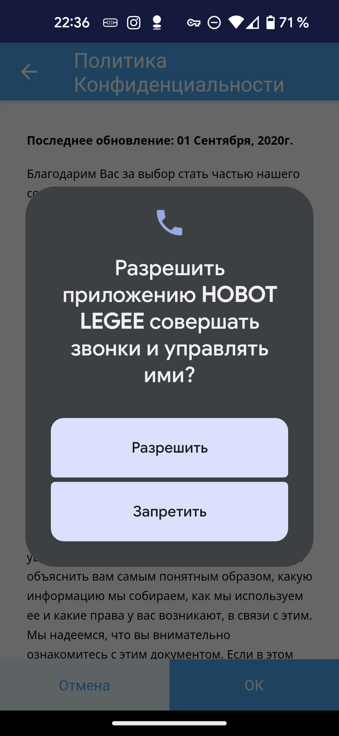 Затем нам следует ознакомиться с пользовательским соглашением и политикой конфиденциальности, после чего предоставить программе права на доступ к уведомлениям и — непонятно зачем — на совершение звонков. Последнее мы посчитали излишним и отклонили запрос, что никак не сказалось на функциональности.