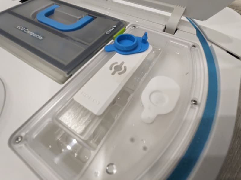 Как уже упоминалось, заряжаться наше устройство может как от традиционной зарядной станции, так и от системы самоочистки LuLu. Для начала работы с этим аксессуаром следует установить его на место базы, заполнить резервуар для чистой воды и заменить на пылесосе резиновую пробку: установленную по умолчанию затычку синего цвета сменить на входящую в комплект станции белую.