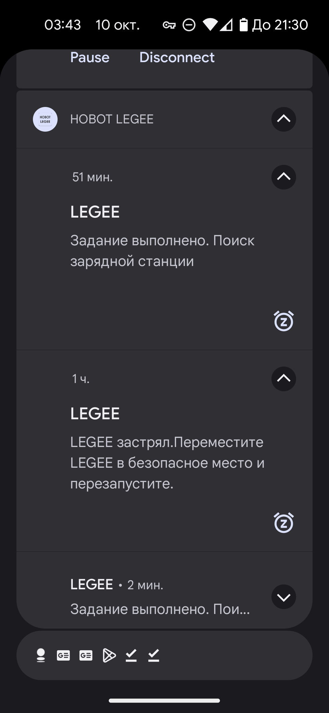 Об успешном выполнении заданий и возникающих проблемах робот сообщает пользователю с помощью пуш-уведомлений.