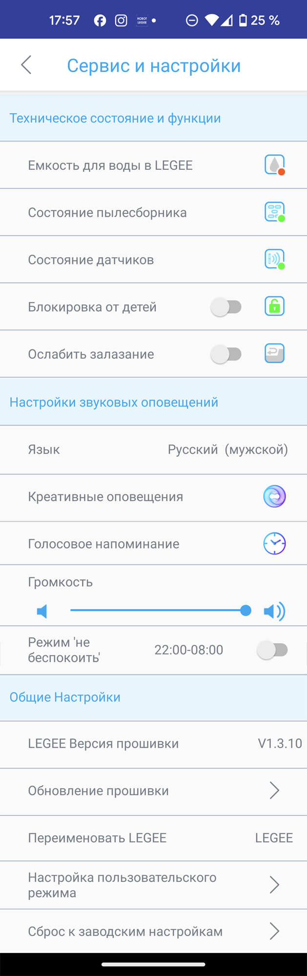 В разделе «Сервис и настройки» пользователь может ознакомиться с состоянием датчиков прибора, проследить за уровнем заполнения резервуаров для чистой и грязной воды, настроить режим блокировки от детей, обновить прошивку или сбросить устройство к заводским установкам.