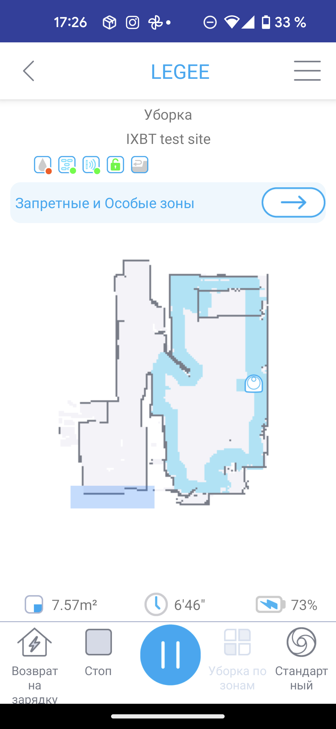 Мы представляем результаты тестирования устройства по нашей методике, подробно описанной в отдельной статье. Перед началом тестов мы, как обычно, запускаем устройство несколько минут побегать по полигону, чтобы ознакомиться с планом помещения и конфигурацией препятствий, после чего производим тестовую уборку.