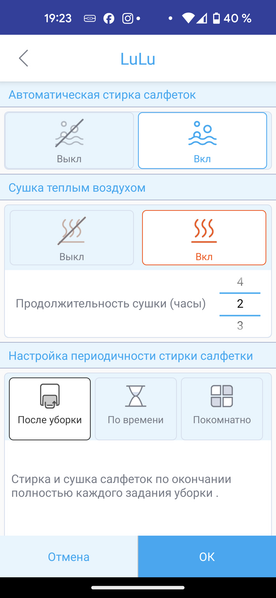 При наличии станции самоочистки салфеток, синхронизированной с роботом, приложение позволяет включить или выключить стирку и сушку, а также настроить запуск станции: после каждой уборки всего помещения, выбранной комнаты или по времени.
