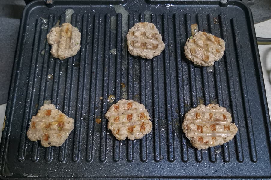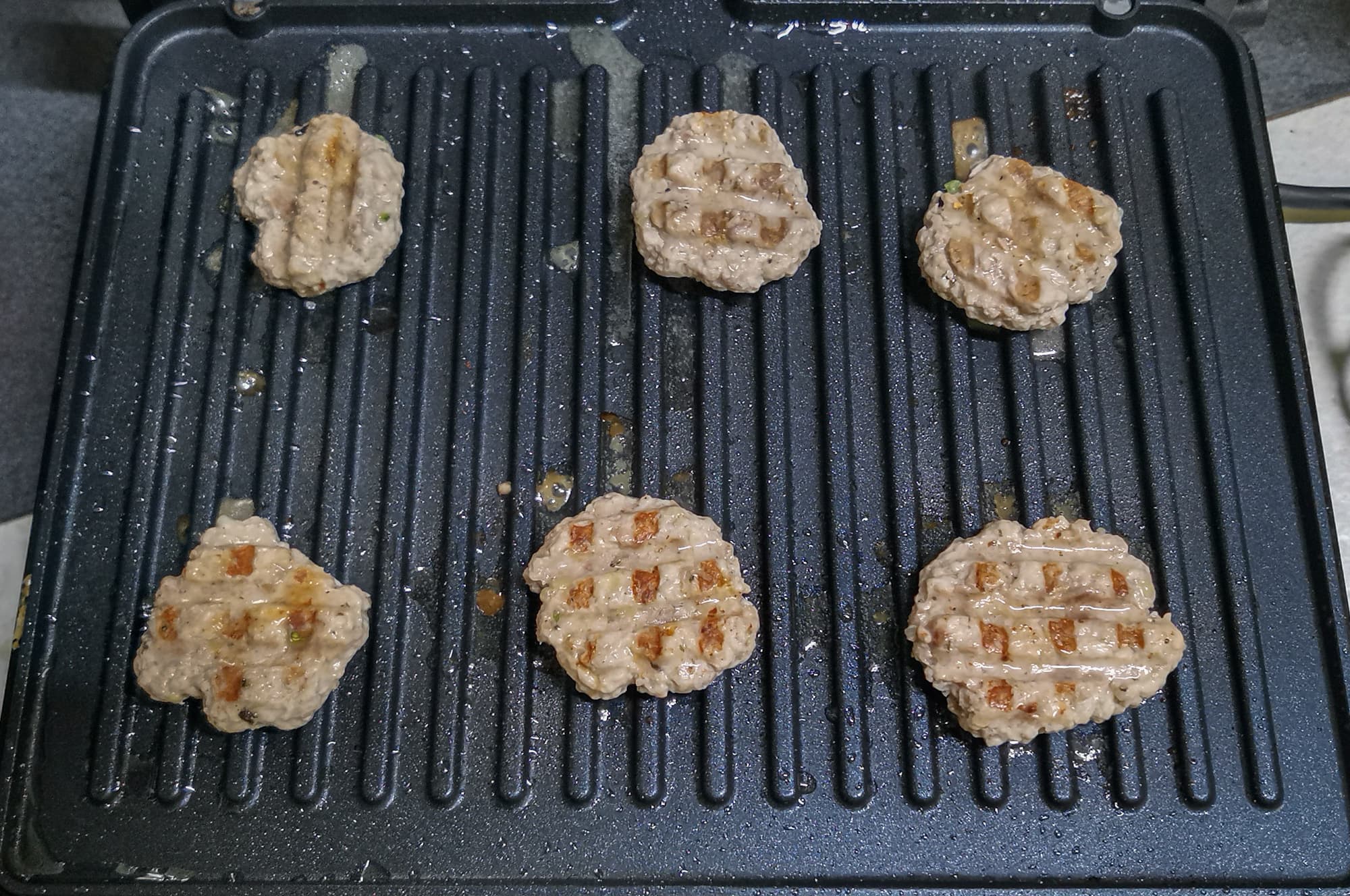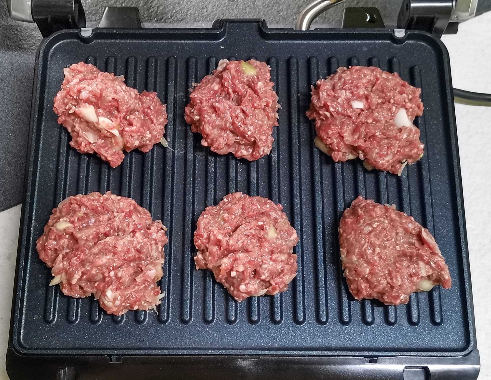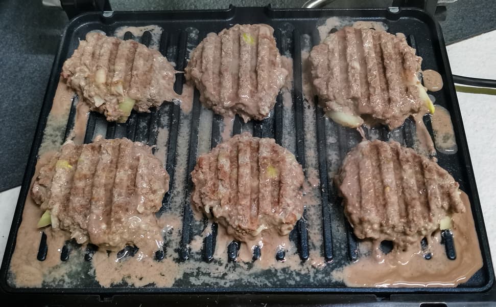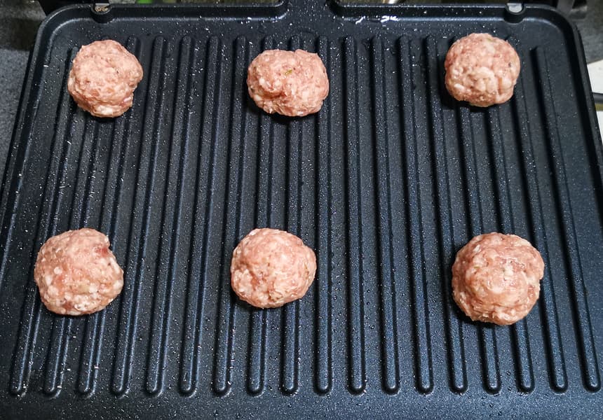 Мы решили проверить, изменится ли ситуация, если на гриль будет положено меньше продуктов. Сформировали маленькие шарики из фарша, положили на разогретую поверхность, прижали верхней панелью.
