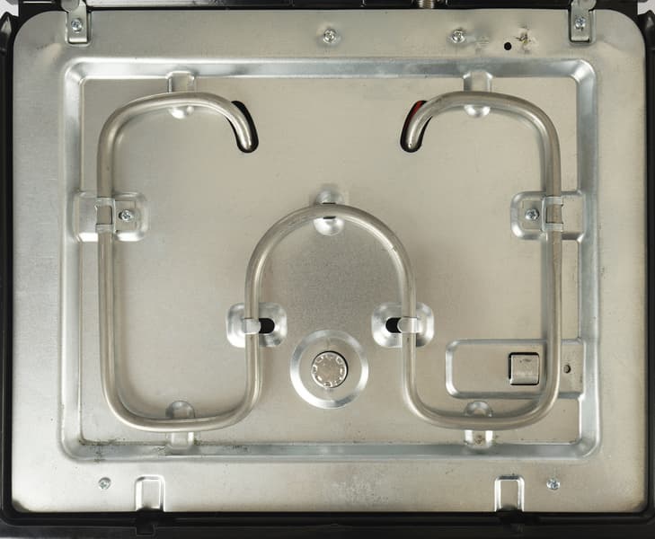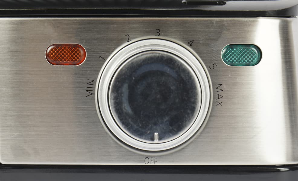 Спереди справа на приборе располагается поворотная ручка регулировки термостата и два индикатора по бокам. Красный левый индикатор загорается после включения прибора в сеть и горит постоянно. Правый индикатор загорается, когда гриль находится в режиме нагрева (потребляет электричество) и гаснет при паузе.