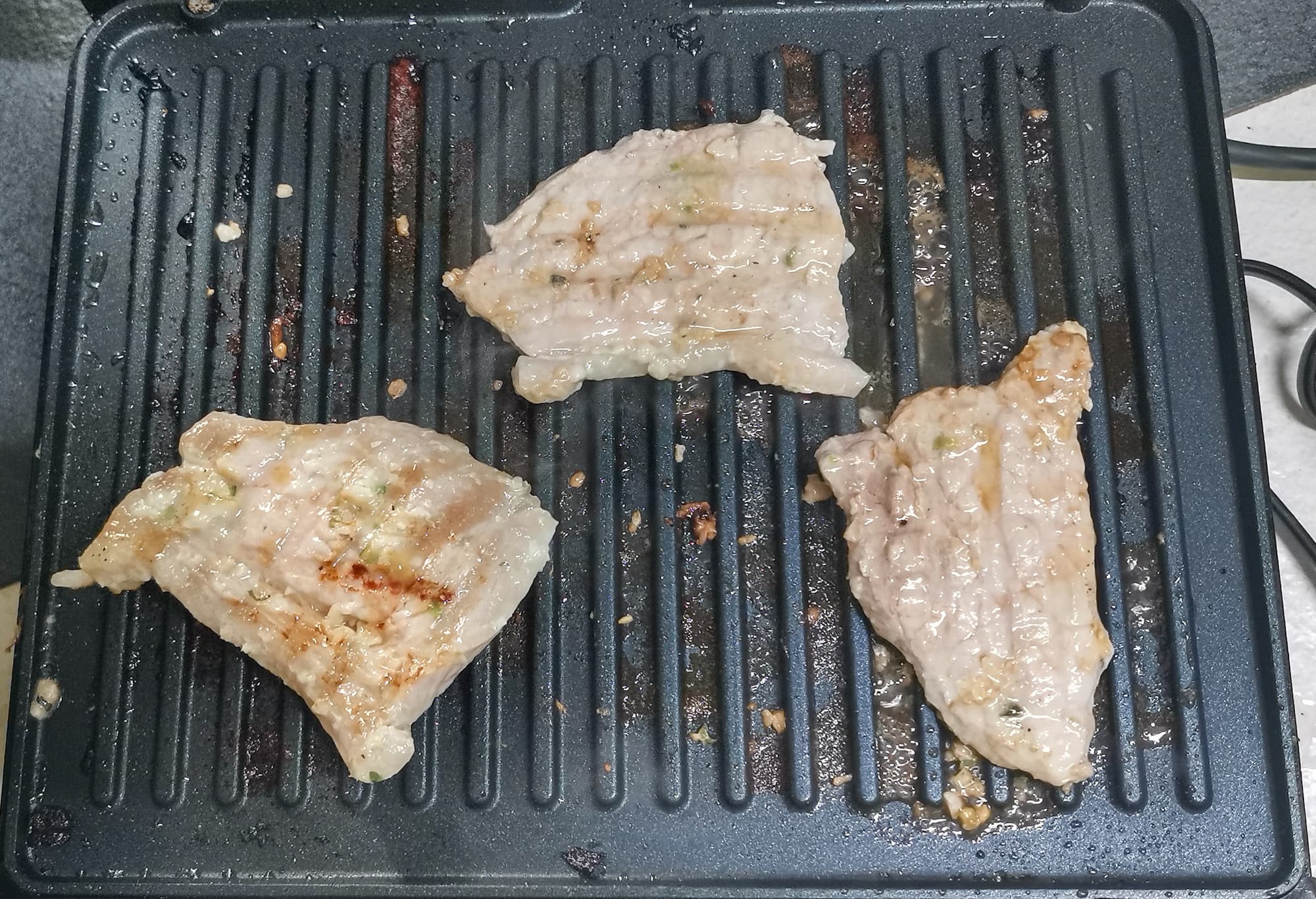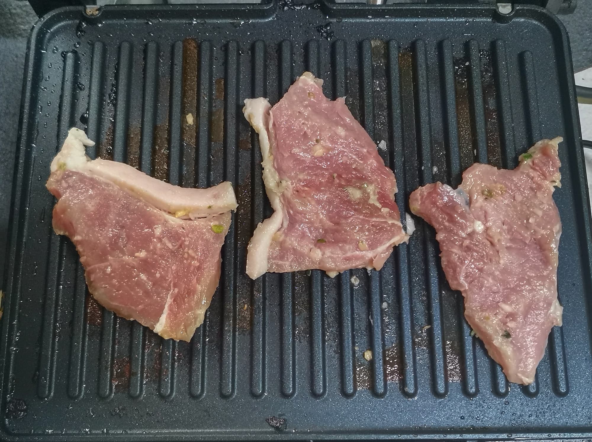 Замаринованные небольшие куски свинины положили на гриль при максимальном нагреве. Прижали крышкой.