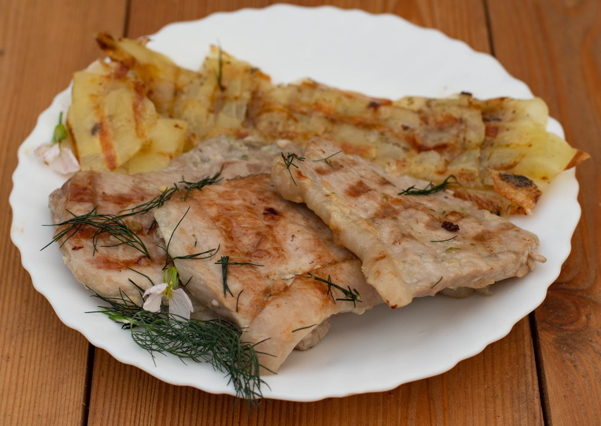 Совместили картошку с мясом, подали. Картошка получилась хорошо, мясо было суховато и без прожаренной корочки.
