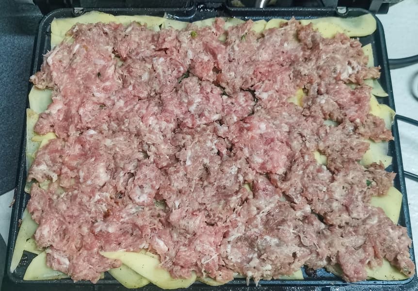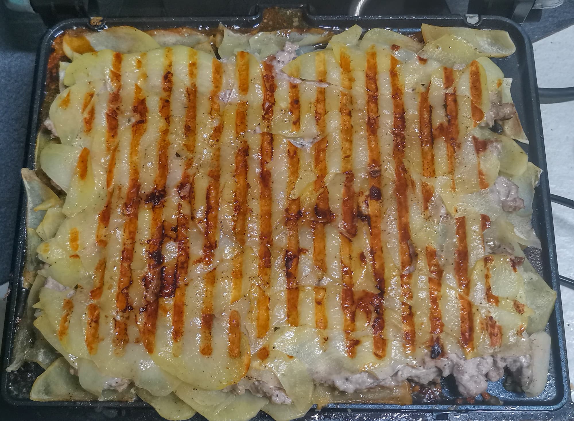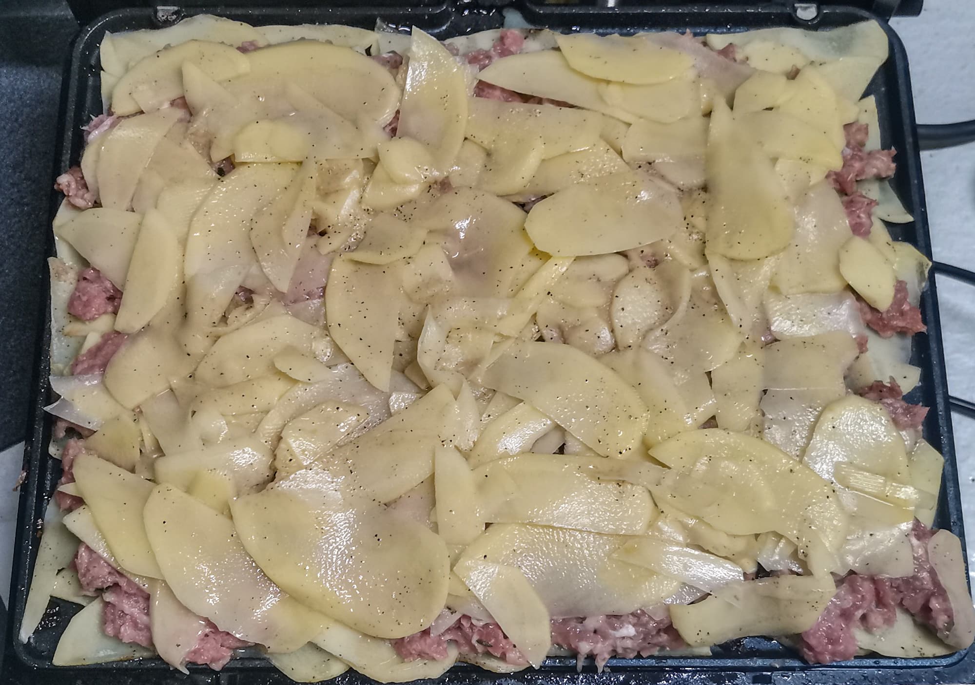 Сверху положили второй слой картошки, посыпали специями, немного сбрызнули маслом. Закрыли крышку гриля, которая сама легла на запеканку, создав нужное расстояние между панелями, без перекосов.