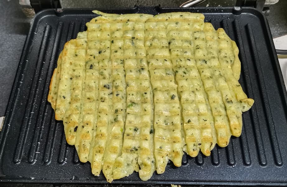 Кабачки измельчили, добавили яйцо и муку, из теста сделали овощные вафли, выливая тесто на разогретую поверхность и прижимая крышкой. Дополнительно сбрызгивали маслом верх для лучшей корочки.