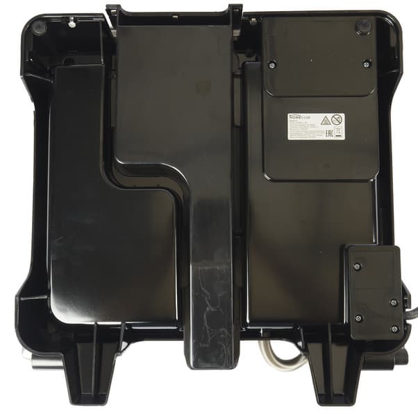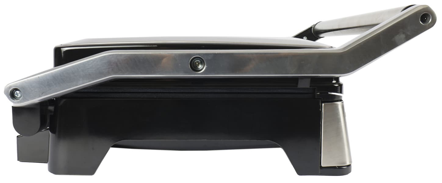 Сзади прибора находится гибкий электрошнур соединения панелей в металлической оплетке и носик слива излишней жидкости. Сбоку на шарнире ручки находится кнопка, позволяющая при нажатии раскрыть панели гриля на 180°.