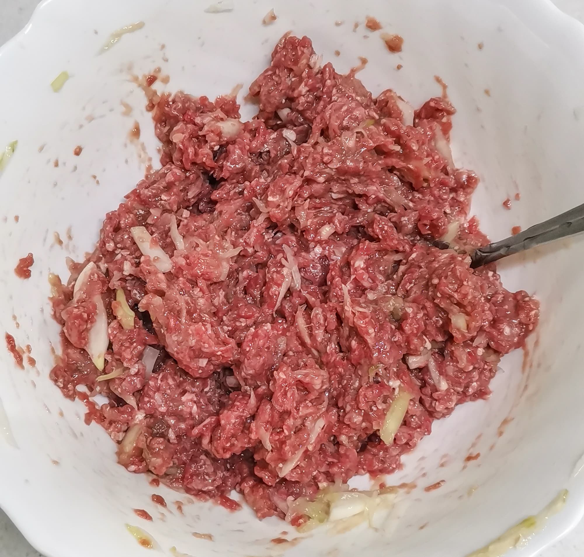 Мы взяли свиной нежирный фарш, добавили лук и специи.