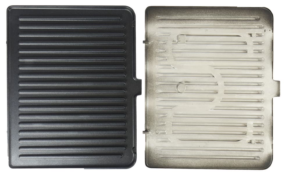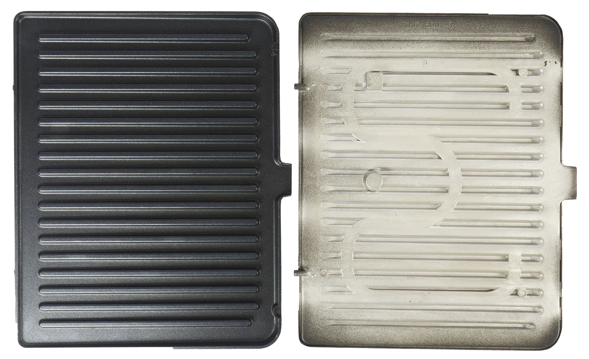 Из плюсов нужно отметить добротные сменные панели с хорошим антипригарным покрытием и достаточной высотой рисунка. Панели сделаны из толстого алюминия, поэтому прогреваются и удерживают тепло равномернее. Замеры показали очень маленький разброс температуры поверхностей. Для того чтобы вынуть или вставить панели, нужно нажать кнопку отсоединения. Верхняя кнопка на нашем образце заедала и требовала определенных дополнительных действий, но привыкнув, мы уже вставляли панель до щелчка без особых проблем.