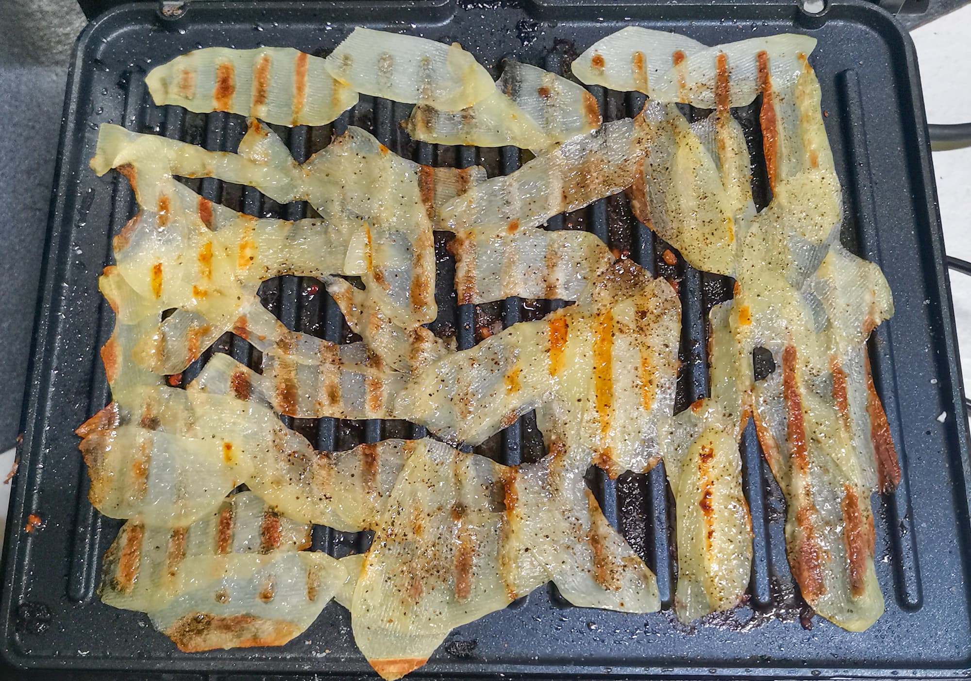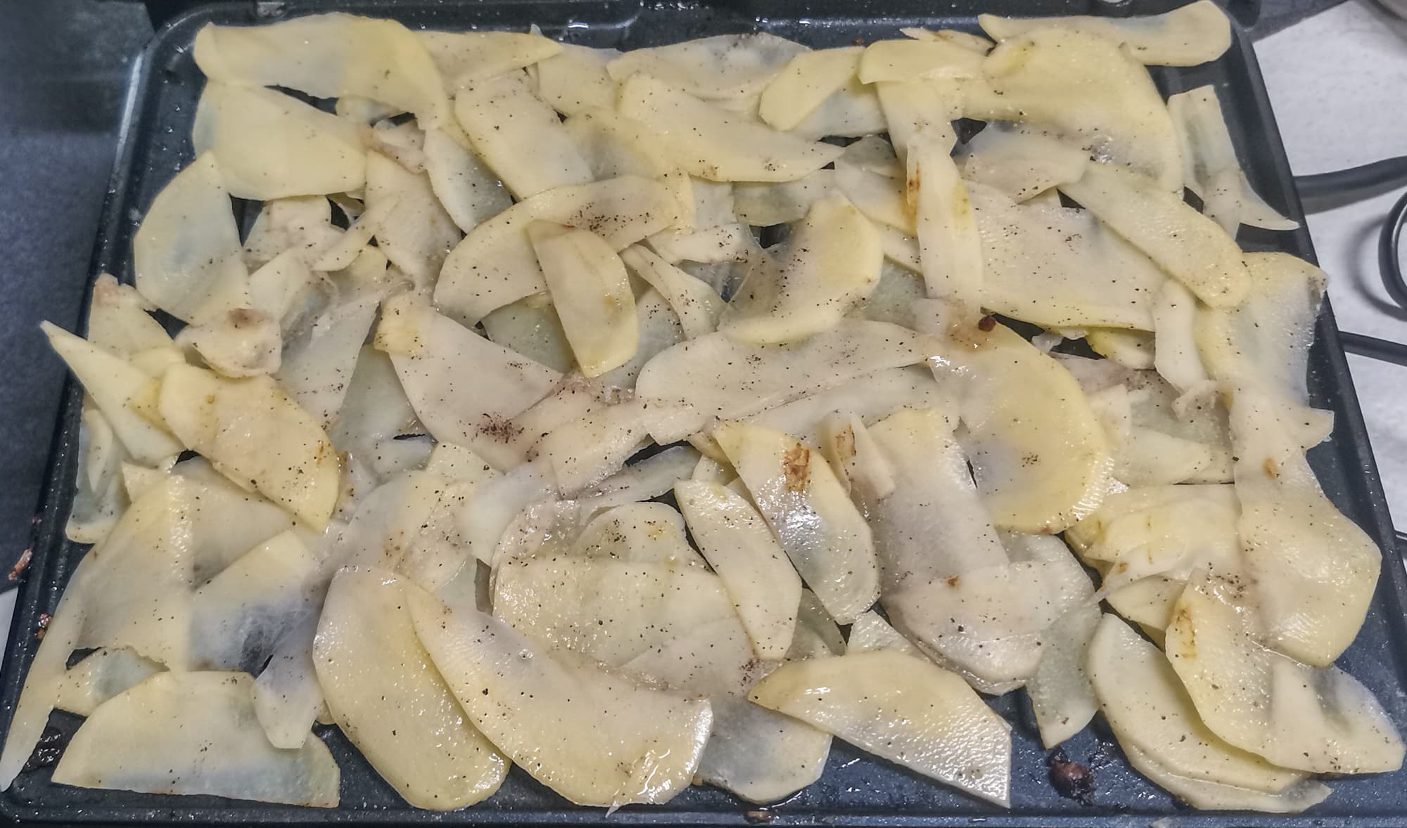 Протерли панели после свинины, выложили на них картофельные слайсы, посыпали солью и перцем. Готовили на максимальном нагреве.