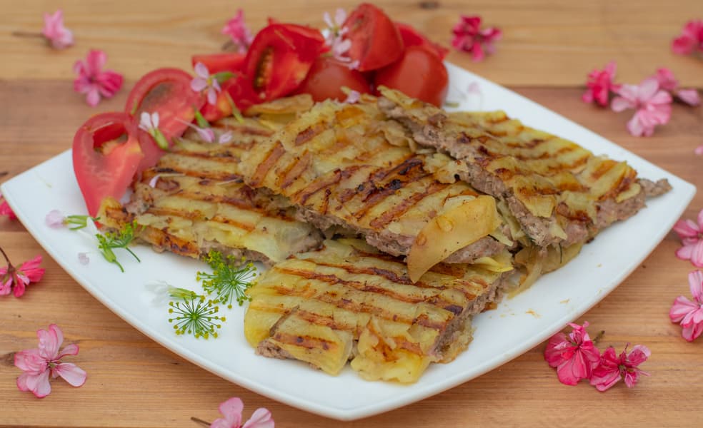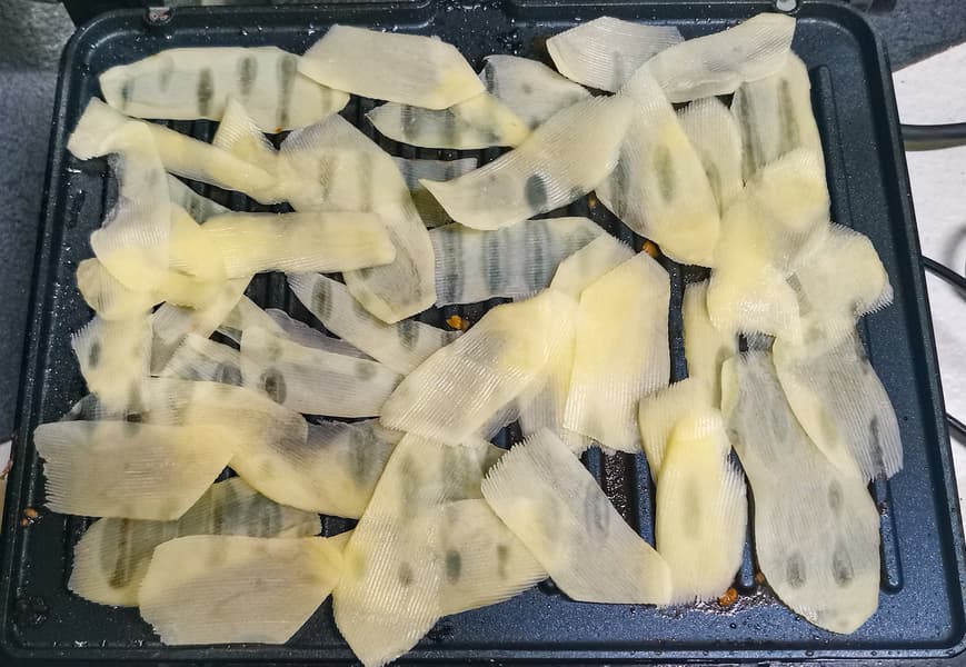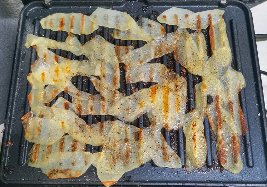 Через некоторое время картошка поджарилась. Мы скатали ее рулетом и, прижав панелью гриля, дожарили дополнительно.